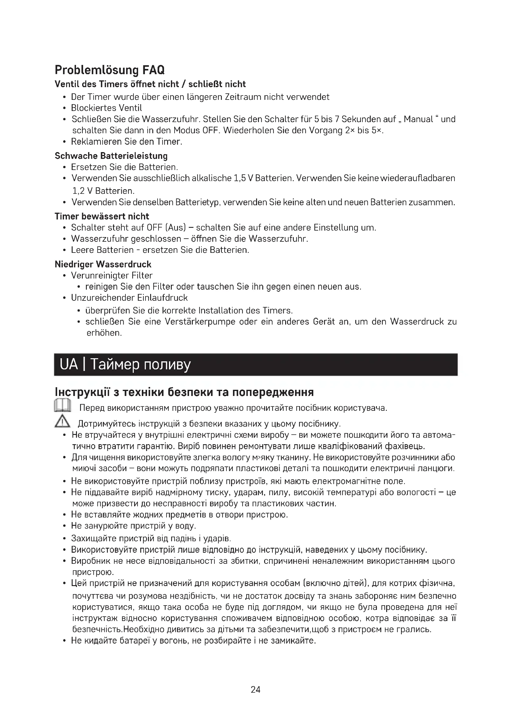 - schließen Sie eine Verstärkerpumpe oder ein anderes Gerät an, um den Wasserdruck zu erhöhen. UA | Таймер поливу Інструкції з техніки безпеки та попередження Перед використанням пристрою уважно прочитайте посібник користувача. Дотримуйтесь інструкцій з безпеки вказаних у цьому посібнику.