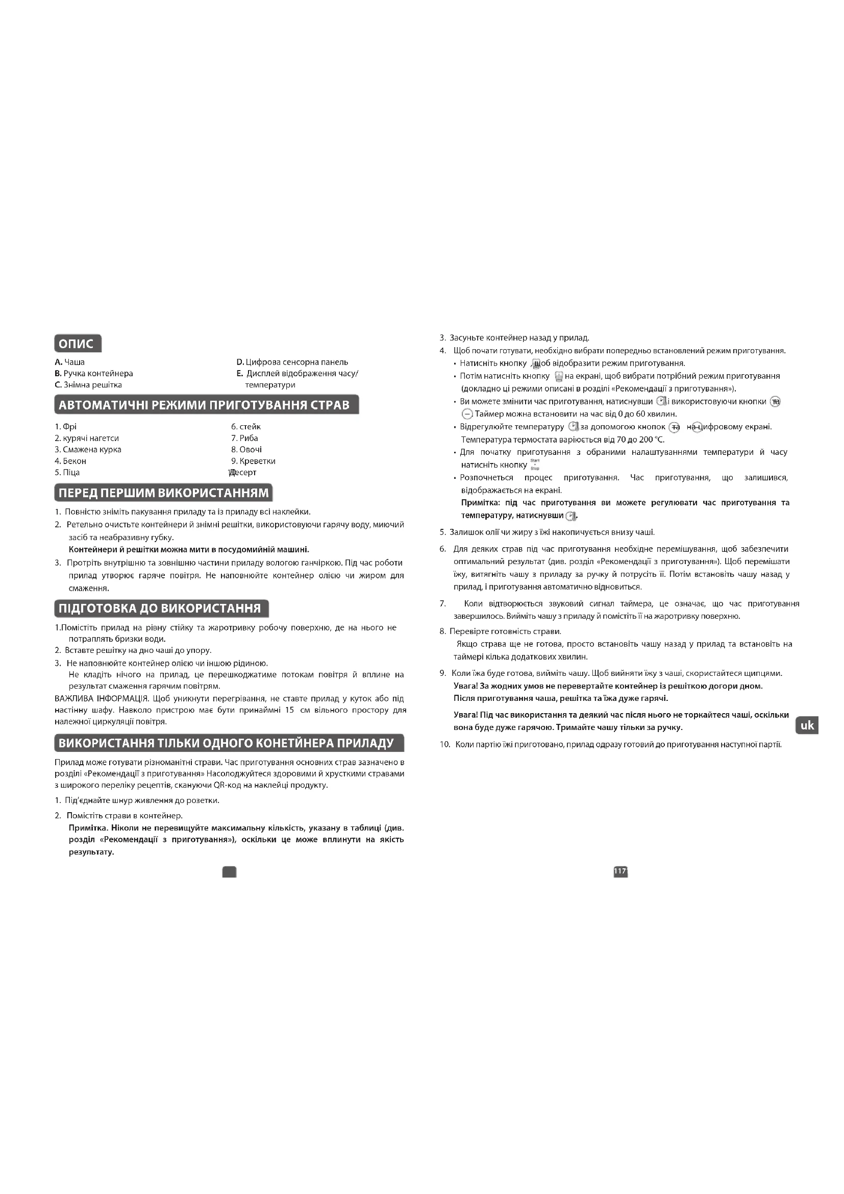 прилад утворює гаряче повітря. Не наповнюйте контейнер олією чи жиром для
