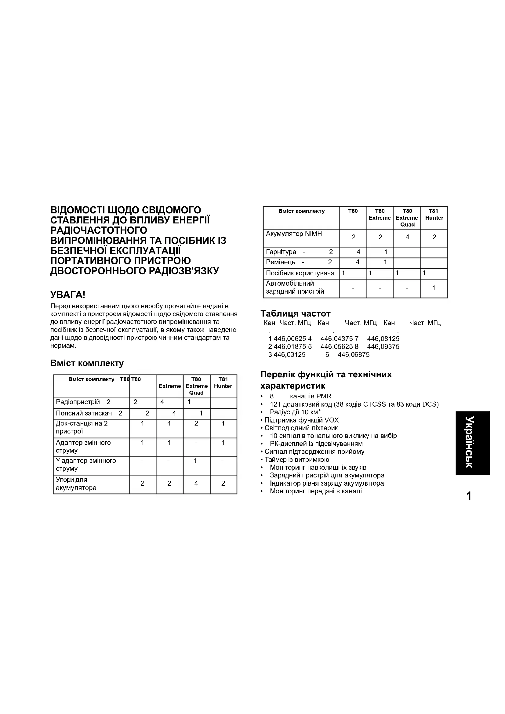 Вміст комплекту Таблиця частот Перелік функцій та технічних характеристик