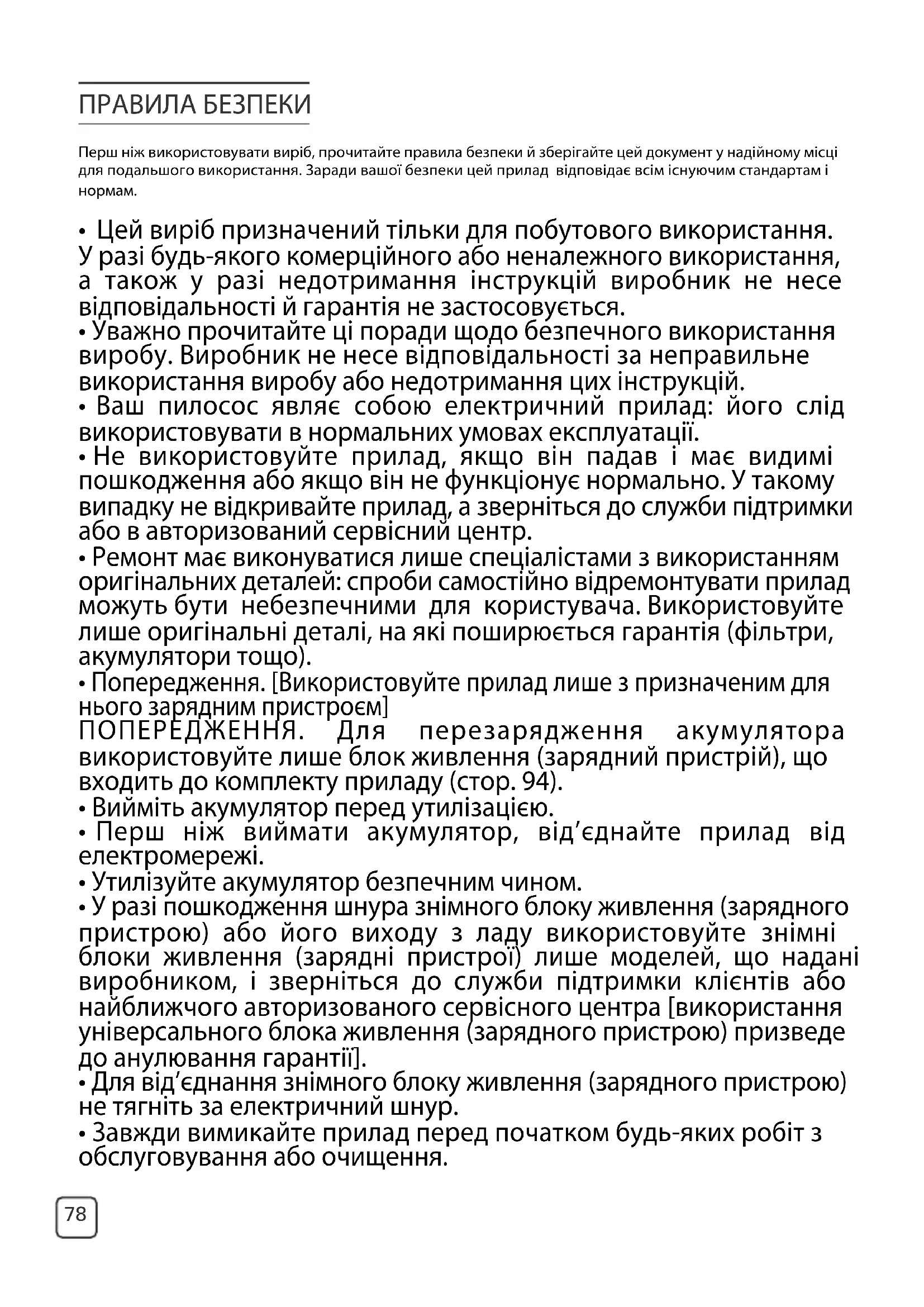 - Не мийте елементи пилозбірника або захисного фільтра двигуна в посудомийній машині. ПРАВИЛА БЕЗПЕКИ ПІД ЧАС ВИКОРИСТАННЯ АКУМУЛЯТОРА