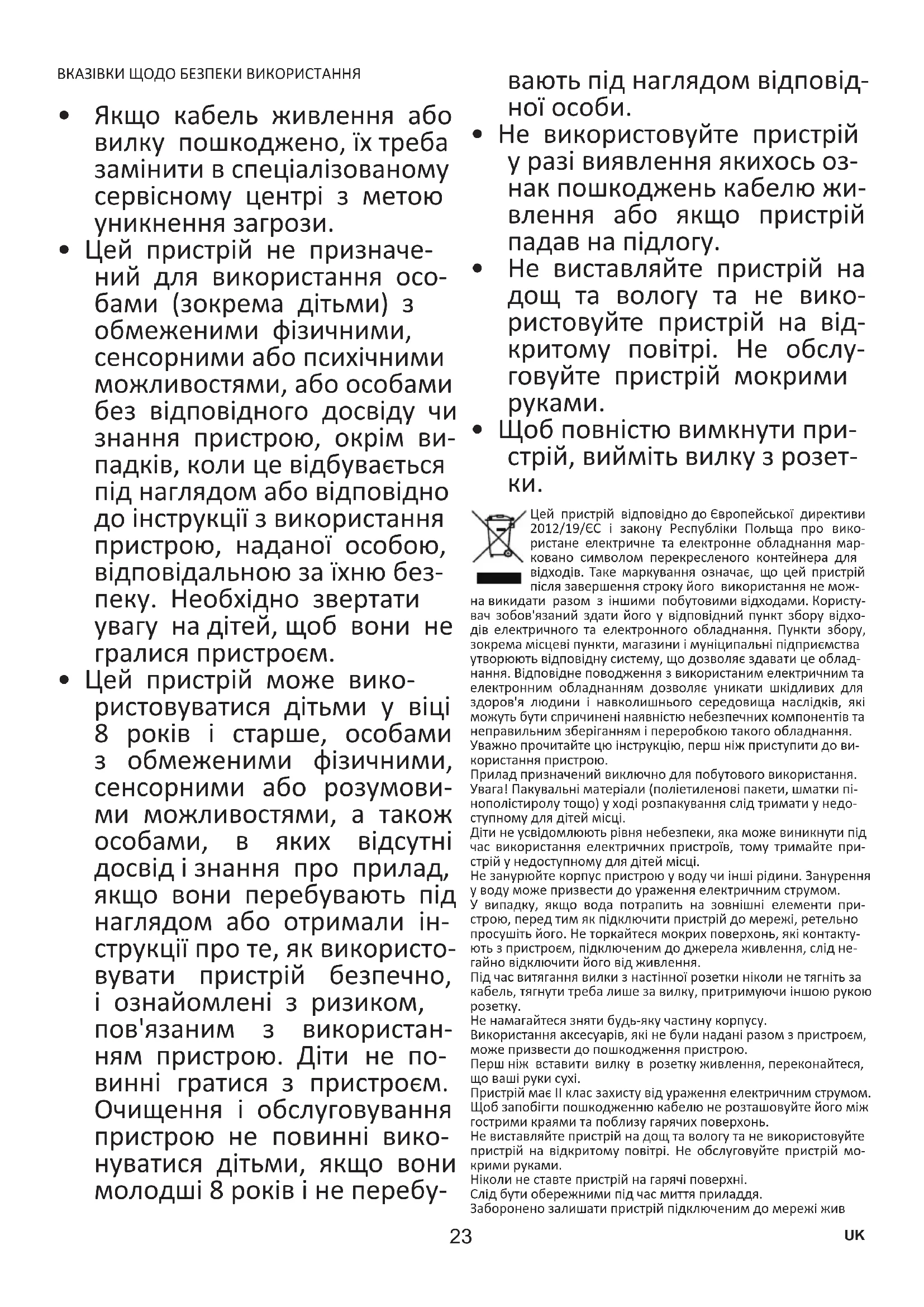 Цей пристрій відповідно до Європейської директиви 2012/19/ЄС і закону Республіки Польща про вико- ристане електричне та електронне обладнання мар- ковано символом перекресленого контейнера для відходів. Таке маркування означає, що цей пристрій після завершення строку його використання не мож- на викидати разом з іншими побутовими відходами. Користу- вач зобов'язаний здати його у відповідний пункт збору відхо- дів електричного та електронного обладнання. Пункти збору, зокрема місцеві пункти, магазини і муніципальні підприємства утворюють відповідну систему, що дозволяє здавати це облад- нання. Відповідне поводження з використаним електричним та електронним обладнанням дозволяє уникати шкідливих для здоров'я людини і навколишнього середовища наслідків, які можуть бути спричинені наявністю небезпечних компонентів та неправильним зберіганням і переробкою такого обладнання. Уважно прочитайте цю інструкцію, перш ніж приступити до ви- користання пристрою. Прилад призначений виключно для побутового використання. Увага! Пакувальні матеріали (поліетиленові пакети, шматки пі- нополістиролу тощо) у ході розпакування слід тримати у недо- ступному для дітей місці. Діти не усвідомлюють рівня небезпеки, яка може виникнути під час використання електричних пристроїв, тому тримайте при- стрій у недоступному для дітей місці. Не занурюйте корпус пристрою у воду чи інші рідини. Занурення у воду може призвести до ураження електричним струмом. У випадку, якщо вода потрапить на зовнішні елементи при- строю, перед тим як підключити пристрій до мережі, ретельно просушіть його. Не торкайтеся мокрих поверхонь, які контакту- ють з пристроєм, підключеним до джерела живлення, слід не- гайно відключити його від живлення. Під час витягання вилки з настінної розетки ніколи не тягніть за кабель, тягнути треба лише за вилку, притримуючи іншою рукою