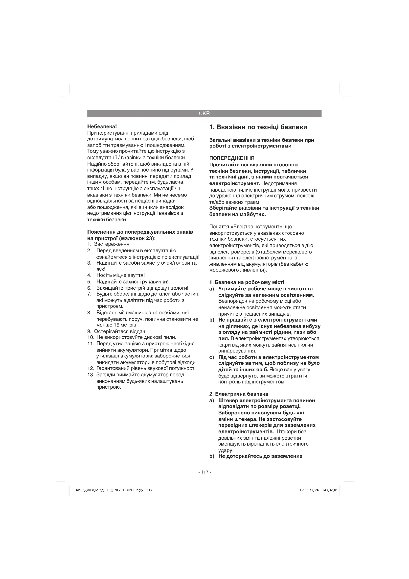 поводження з ними a) Не перевантажуйте електроінструмент. Використовуйте для роботи передбачений для цього електроінструмент. З належним електроінструментом ви працюєте Anl_36VBC2_33_1_SPK7_PRINT.indb 118Anl_36VBC2_33_1_SPK7_PRINT.indb 118 12.11.2024 14:04:0212.11.2024 14:04:02UKR