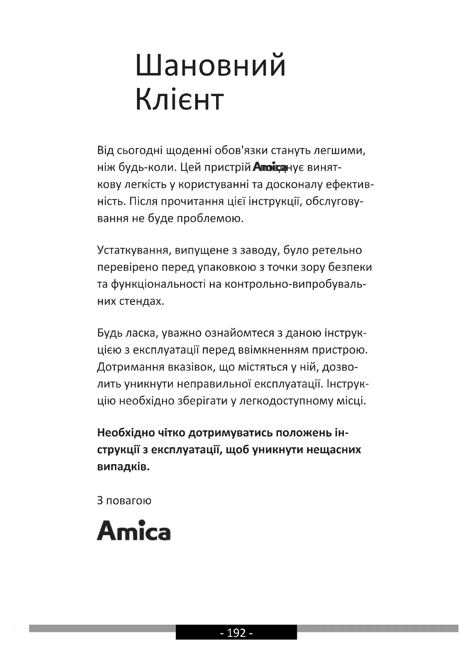 Від сьогодні щоденні обов'язки стануть легшими, ніж будь-коли. Цей пристрій поєднує винят- кову легкість у користуванні та досконалу ефектив- ність. Після прочитання цієї інструкції, обслугову- вання не буде проблемою. Устаткування, випущене з заводу, було ретельно перевірено перед упаковкою з точки зору безпеки та функціональності на контрольно-випробуваль- них стендах. Будь ласка, уважно ознайомтеся з даною інструк- цією з експлуатації перед ввімкненням пристрою. Дотримання вказівок, що містяться у ній, дозво- лить уникнути неправильної експлуатації. Інструк- цію необхідно зберігати у легкодоступному місці. Необхідно чітко дотримуватись положень ін- струкції з експлуатації, щоб уникнути нещасних