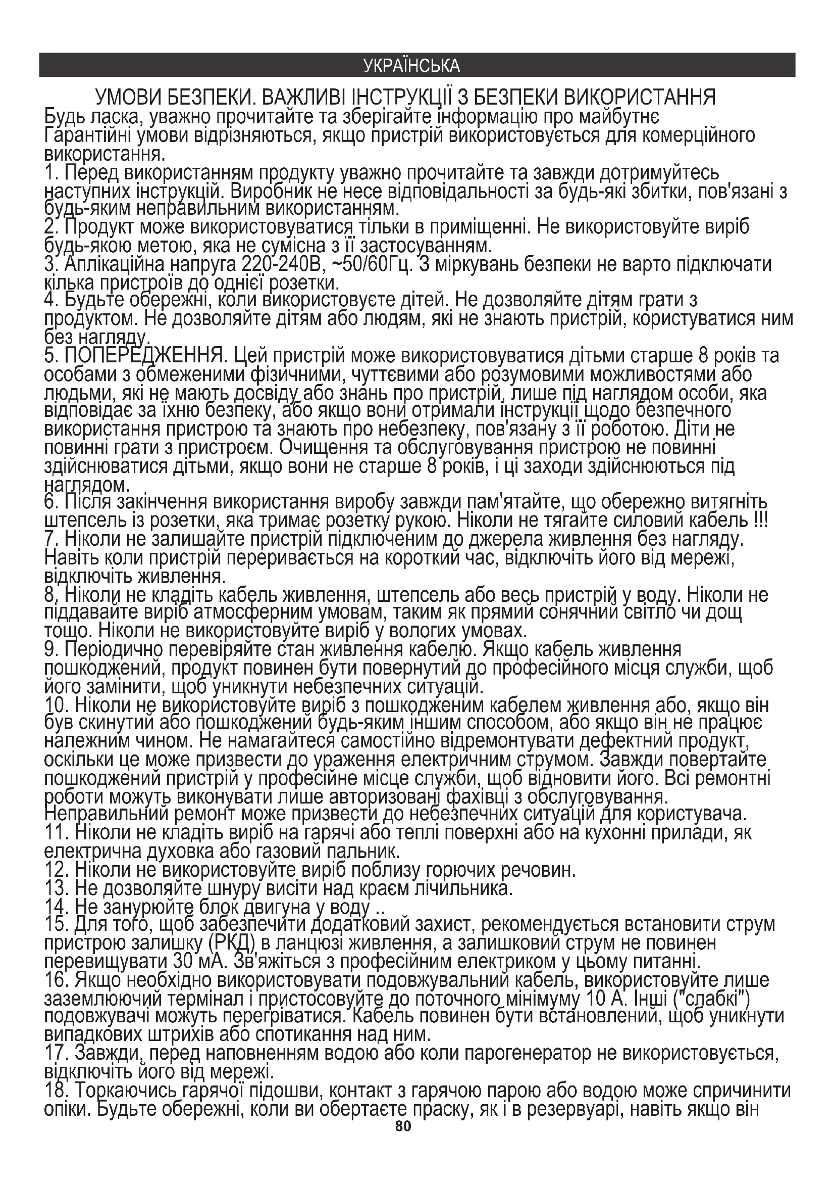 ОЧИЩЕННЯ ТА ОБСЛУГОВУВАННЯ Потужність ном .: 2400 Вт Вийміть вилку з розетки. Зпорожніть праску, відкривши кришку резервуара для води і утримуючи її за кінець, зверху вниз. Злегка струсіть її над раковиною, а потім закрийте кришку. Щоб висушити решту вологи, знову ввімкніть праску за допомогою ручки регулювання термостата (I) у положення MAX, перемикач регулювання пари (C) у положення MAX, доки не погасне індикатор живлення (M). Вимкніть штепсель з розетки і дайте охолонути. Очистіть підошву сухою ганчіркою, оскільки сліди вологи можуть позначитись на ній. Будь ласка, віддайте картонну упаковку в місце збору мукулатури. Політиленові мішки (PE) викинути в смітник для пластику. Відпрацьований пристрій повинен бути відправлений у відповідну точку зберігання, тому що в пристрої є небезпечні інгредієнти, які можуть становити загрозу навколишньому середовищу. Електричний пристрій потрібно повернути так, щоб обмежити його повторне використання. Якщо у пристрої є батерейки, то потрібно їх витягнути і віддати до відповідного пунтку. У інтересах навколишнього середовища. 83BEZPEČNOSTNÉ PODMIENKY. DÔLEŽITÉ POKYNY PRE BEZPEČNOSŤ POUŽITIA PREČÍTAJTE POZORNE A UCHOVÁVAJTE PRE BUDÚCE REFERENCIE Podmienky záruky sú odlišné, ak sa zariadenie používa na komerčné účely.