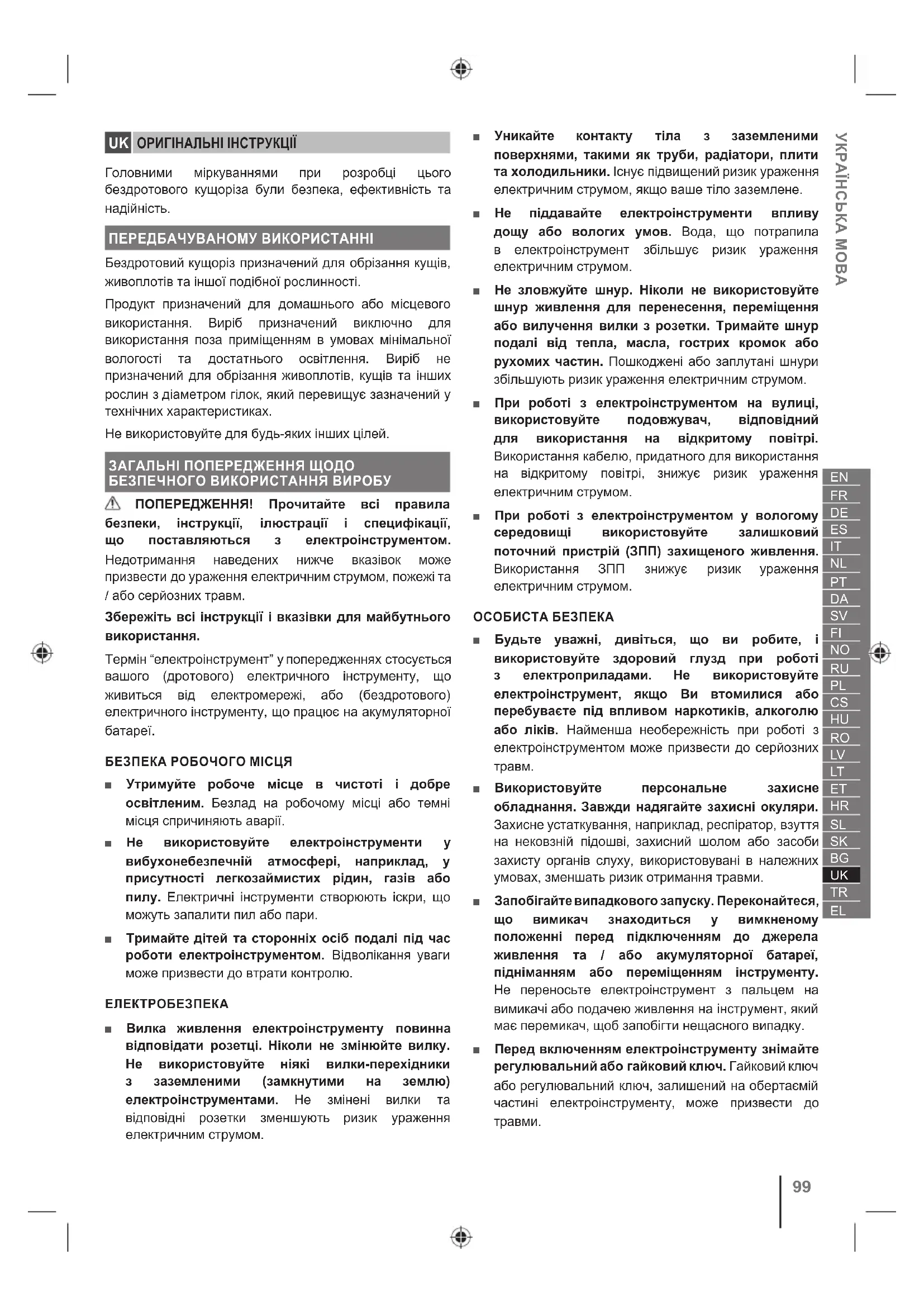 Носіть неслизькі, надміцні рукавички. Носіть нековзне захисне взуття при використанні продукту. Для запобігання серйозних травм не торкайтеся лез. Завжди тримайте виріб обома руками при роботі. Не піддавайте впливу дощу або вологих умов. Остерігайтеся кинутих або літаючих об'єктів. Сторонні особи, діти та хатні тварини повинні знаходитися не ближче 15 м від робочої зони. Вийміть батарею перед початком ремонту або технічного обслуговування приладу. Гарантований рівень звукової
