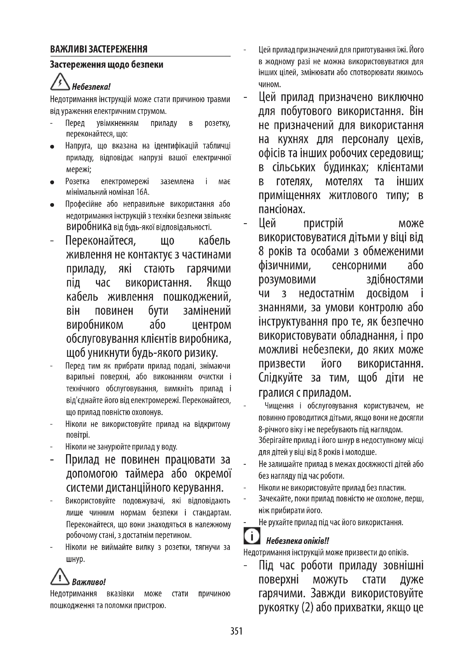 - Цей пристрій може використовуватися дітьми у віці від 8 років та особами з обмеженими фізичними, сенсорними або розумовими здібностями чи з недостатнім досвідом і знаннями, за умови контролю або інструктування про те, як безпечно використовувати обладнання, і про можливі небезпеки, до яких може призвести його використання. Слідк уйте за тим, щоб діти не гралися с приладом. - Чищення і обслуговування користувачем, не повинно проводитися дітьми, якщо вони не досягли 8-річного віку і не перебувають під наглядом. Зберігайте прилад і його шнур в недоступному місці для дітей у віці від 8 років і молодше. - Не залишайте прилад в межах досяжності дітей або без нагляду під час роботи. - Ніколи не використовуйте прилад без пластин. - Зачекайте, поки прилад повністю не охолоне, перш, ніж прибирати його. - Не рухайте прилад під час його використання. Небезпека опіків!! Недотримання інструкцій може призвести до опіків. - Під час роботи приладу зовнішні поверхні можуть стати дуже гарячими. Завж ди використовуйте рукоятку (2) або прихватки, якщо це352