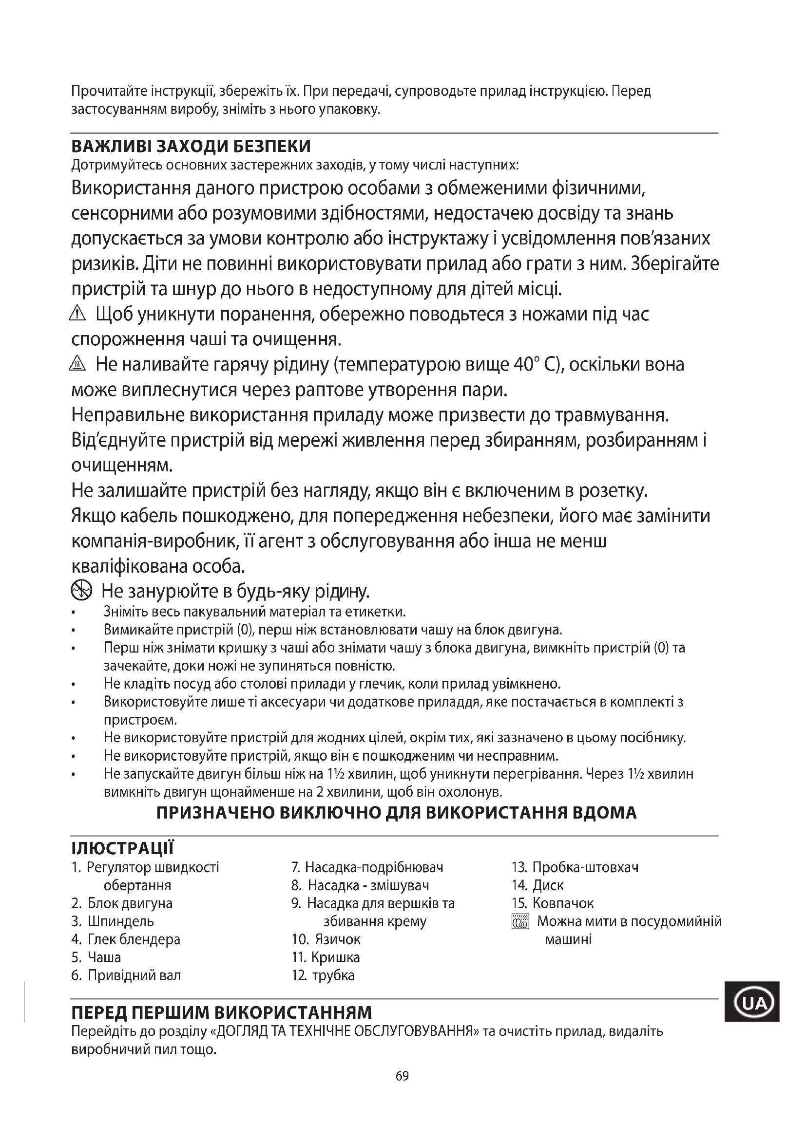 За да се избегнат екологични и здравни проблеми поради наличие на опасни субстанции, уредите, акумулаторните и неакумулаторните батерии, обозначени с един от тези символи, не трябва да се изхвърлят заедно с несортирани общински отпадъци. Винаги изхвърляйте електрически и електронни продукти и, където е приложимо, акумулаторни и неакумулаторни батерии, на подходящо официално място за рециклиране/събиране.69 Прочитайте інструкції, збережіть їх. При передачі, супроводьте прилад інструкцією. Перед застосуванням виробу, зніміть з нього упаковку. ВАЖЛИВІ ЗАХОДИ БЕЗПЕКИ Дотримуйтесь основних застережних заходів, у тому числі наступних: Використання даного пристрою особами з обмеженими фізичними, сенсорними або розумовими здібностями, недостачею досвіду та знань допускається за умови контролю або інструктажу і усвідомлення пов’язаних ризиків. Діти не повинні використовувати прилад або грати з ним. Зберігайте пристрій та шнур до нього в недоступному для дітей місці. c Щоб уникнути поранення, обережно поводьтеся з ножами під час спорожнення чаші та очищення. h Не наливайте гарячу рідину (температурою вище 40° C), оскільки вона може виплеснутися через раптове утворення пари. Неправильне використання приладу може призвести до травмування. Від’єднуйте пристрій від мережі живлення перед збиранням, розбиранням і