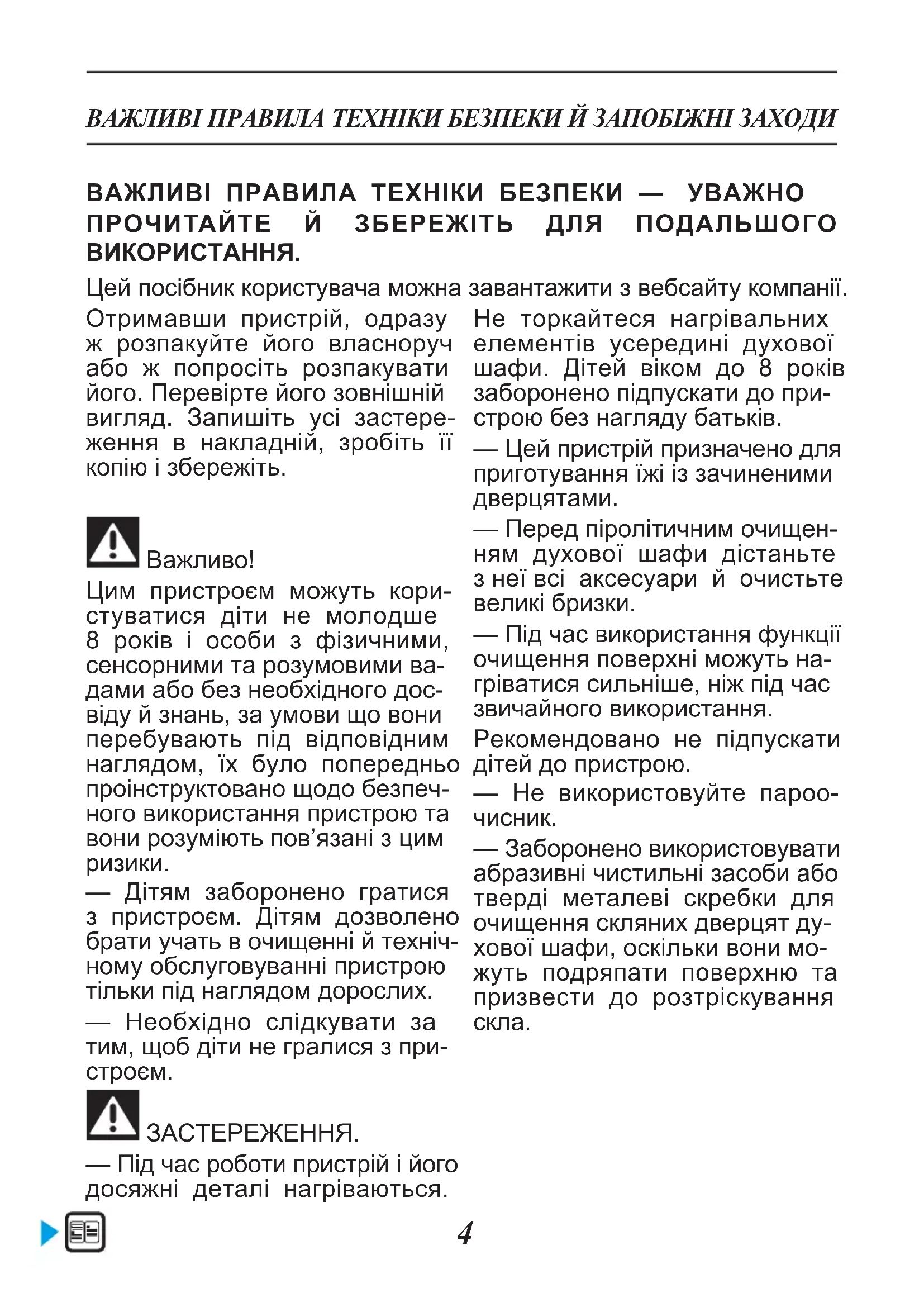 ЗАСТЕРЕЖЕННЯ. — Під час роботи пристрій і його досяжні деталі нагріваються. Не торкайтеся нагрівальних елементів усередині духової шафи. Дітей віком до 8 років заборонено підпускати до при- строю без нагляду батьків. — Цей пристрій призначено для приготування їжі із зачиненими дверцятами. — Перед піролітичним очищен- ням духової шафи дістаньте з неї всі аксесуари й очистьте великі бризки. — Під час використання функції очищення поверхні можуть на- гріватися сильніше, ніж під час звичайного використання. Рекомендовано не підпускати дітей до пристрою. — Не використовуйте пароо-