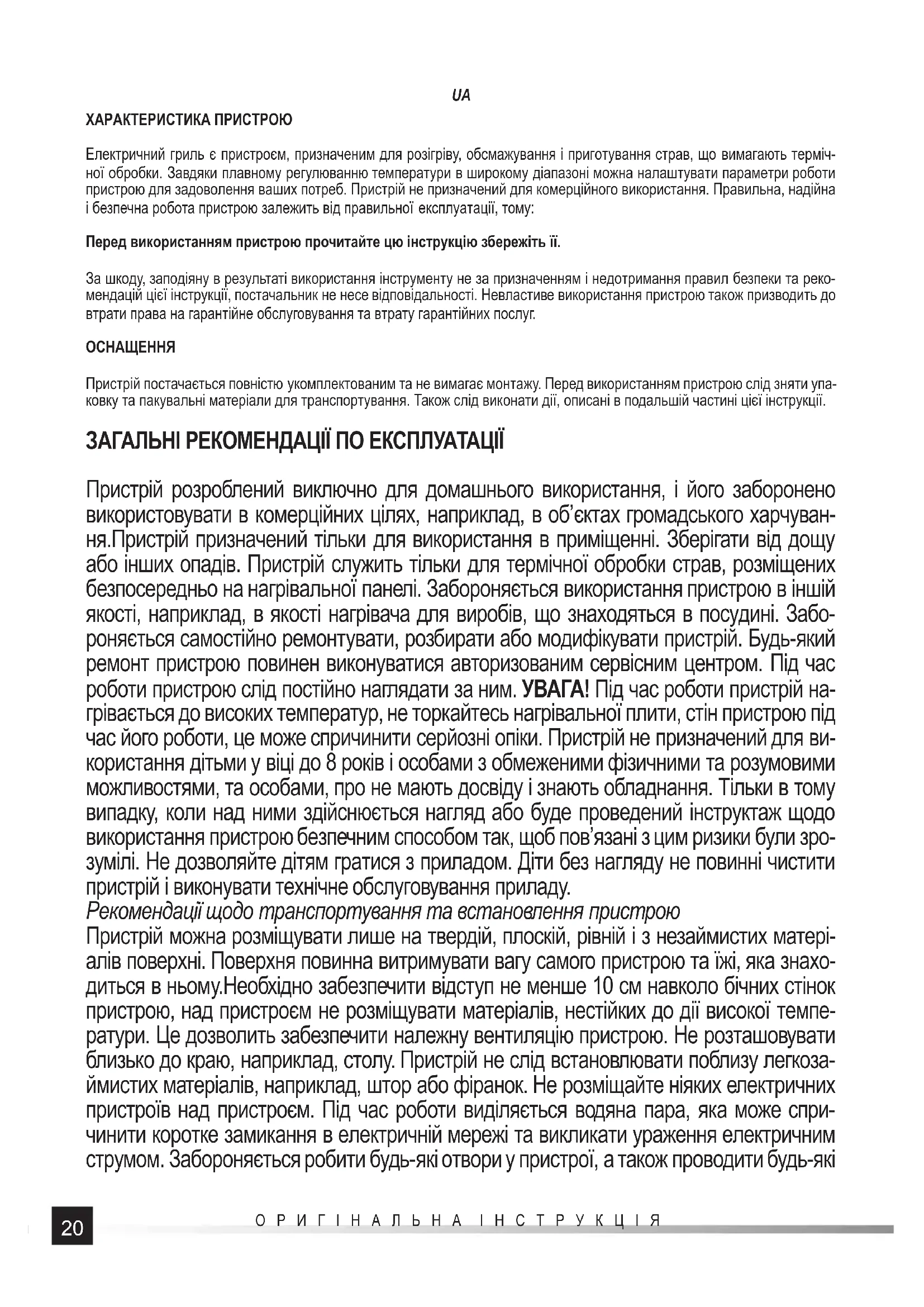 Пристрій постачається повністю укомплектованим та не вимагає монтажу. Перед використанням пристрою слід зняти упа- ковку та пакувальні матеріали для транспортування. Також слід виконати дії, описані в подальшій частині цієї інструкції. ЗАГАЛЬНІ РЕКОМЕНДАЦІЇ ПО ЕКСПЛУАТАЦІЇ Пристрій розроблений виключно для домашнього використання, і його заборонено використовувати в комерційних цілях, наприклад, в об’єктах громадського харчуван- ня.Пристрій призначений тільки для використання в приміщенні. Зберігати від дощу або інших опадів. Пристрій служить тільки для термічної обробки страв, розміщених безпосередньо на нагрівальної панелі. Забороняється використання пристрою в іншій якості, наприклад, в якості нагрівача для виробів, що знаходяться в посудині. Забо- роняється самостійно ремонтувати, розбирати або модифікувати пристрій. Будь-який ремонт пристрою повинен виконуватися авторизованим сервісним центром. Під час роботи пристрою слід постійно наглядати за ним. УВАГА! Під час роботи пристрій на- грівається до високих температур, не торкайтесь нагрівальної плити, стін пристрою під час його роботи, це може спричинити серйозні опіки. Пристрій не призначений для ви- користання дітьми у віці до 8 років і особами з обмеженими фізичними та розумовими можливостями, та особами, про не мають досвіду і знають обладнання. Тільки в тому випадку, коли над ними здійснюється нагляд або буде проведений інструктаж щодо використання пристрою безпечним способом так, щоб пов’язані з цим ризики були зро- зумілі. Не дозволяйте дітям гратися з приладом. Діти без нагляду не повинні чистити пристрій і виконувати технічне обслуговування приладу. Рекомендації щодо транспортування та встановлення пристрою Пристрій можна розміщувати лише на твердій, плоскій, рівній і з незаймистих матері- алів поверхні. Поверхня повинна витримувати вагу самого пристрою та їжі, яка знахо- диться в ньому.Необхідно забезпечити відступ не менше 10 см навколо бічних стінок пристрою, над пристроєм не розміщувати матеріалів, нестійких до дії високої темпе- ратури. Це дозволить забезпечити належну вентиляцію пристрою. Не розташовувати близько до краю, наприклад, столу. Пристрій не слід встановлювати поблизу легкоза- ймистих матеріалів, наприклад, штор або фіранок. Не розміщайте ніяких електричних пристроїв над пристроєм. Під час роботи виділяється водяна пара, яка може спри- чинити коротке замикання в електричній мережі та викликати ураження електричним струмом. Забороняється робити будь-які отвори у пристрої, а також проводити будь-які21 ОРИГІНАЛЬНА ІНСТРУКЦІЯ