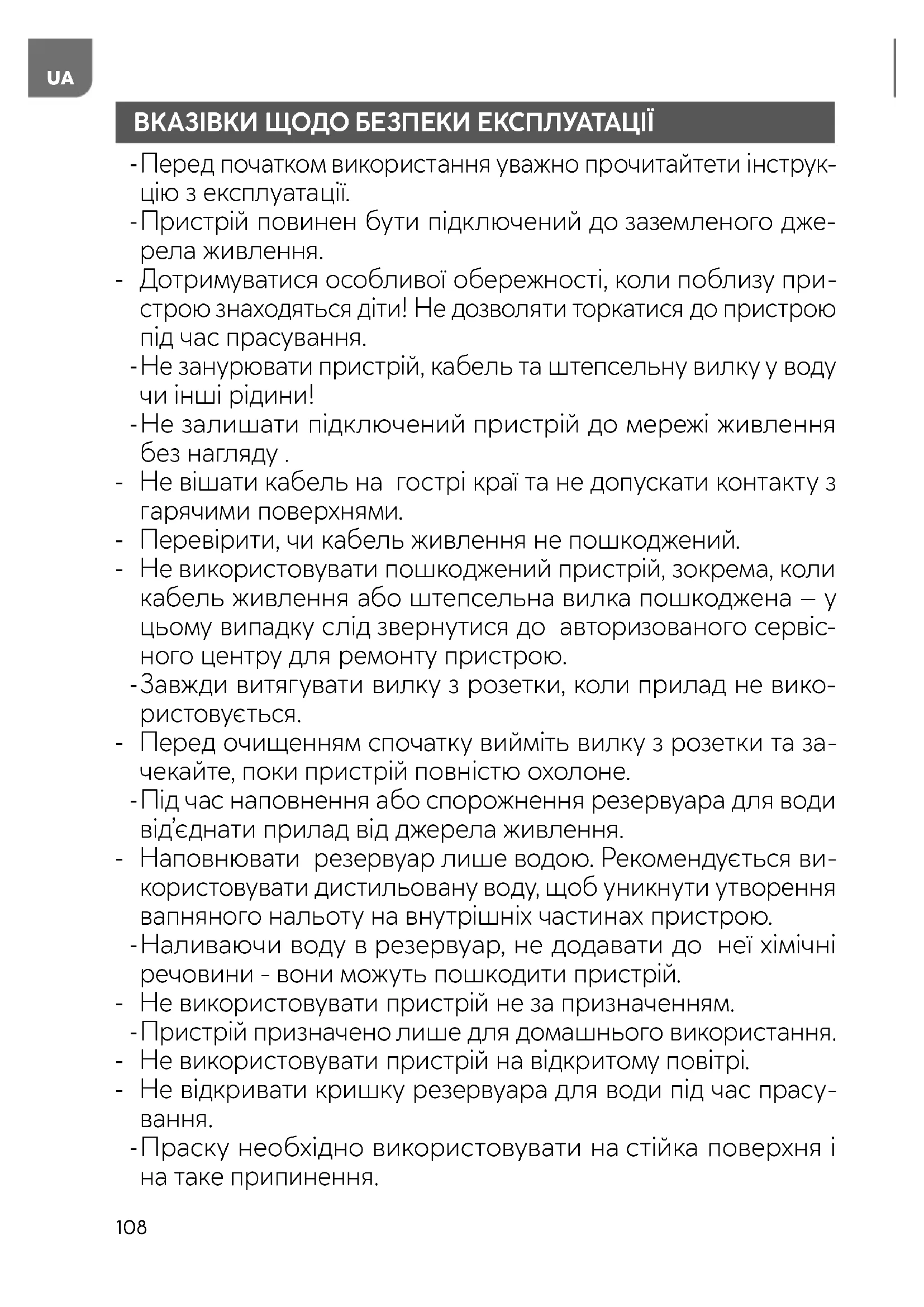Наливаючи воду в резервуар, не додавати до неї хімічні речовини - вони можуть пошкодити пристрій. - Не використовувати пристрій не за призначенням.
