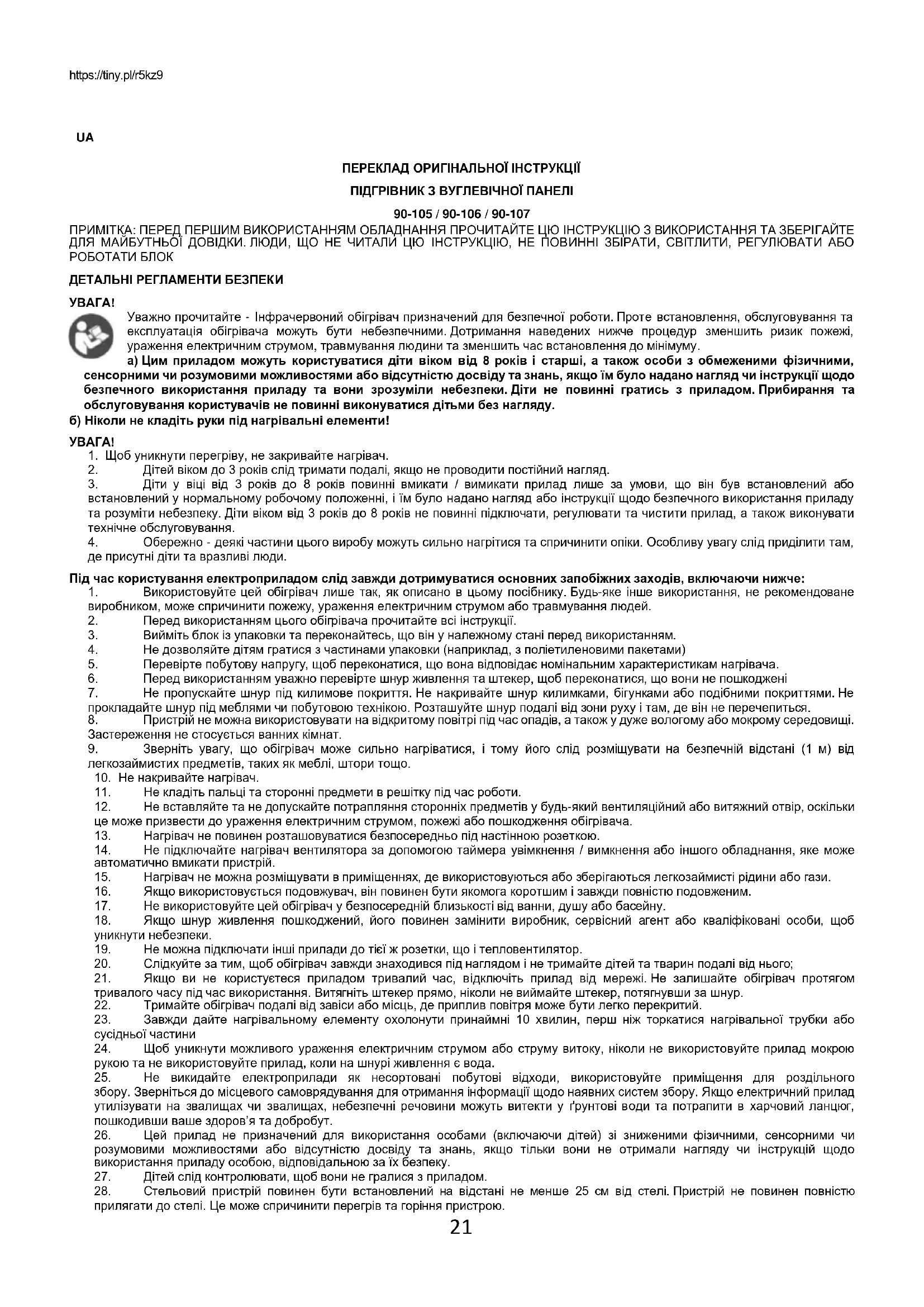 ПЕРЕКЛАД ОРИГІНАЛЬНОЇ ІНСТРУКЦІЇ ПІДГРІВНИК З ВУГЛЕВІЧНОЇ ПАНЕЛІ 90-105 / 90-106 / 90-107 ПРИМІТКА: ПЕРЕД ПЕРШИМ ВИКОРИСТАННЯМ ОБЛАДНАННЯ ПРОЧИТАЙТЕ ЦЮ ІНСТРУКЦІЮ З ВИКОРИСТАННЯ ТА ЗБЕРІГАЙТЕ ДЛЯ МАЙБУТНЬОЇ ДОВІДКИ. ЛЮДИ, ЩО НЕ ЧИТАЛИ ЦЮ ІНСТРУКЦІЮ, НЕ ПОВИННІ ЗБІРАТИ, СВІТЛИТИ, РЕГУЛЮВАТИ АБО РОБОТАТИ БЛОК ДЕТАЛЬНІ РЕГЛАМЕНТИ БЕЗПЕКИ