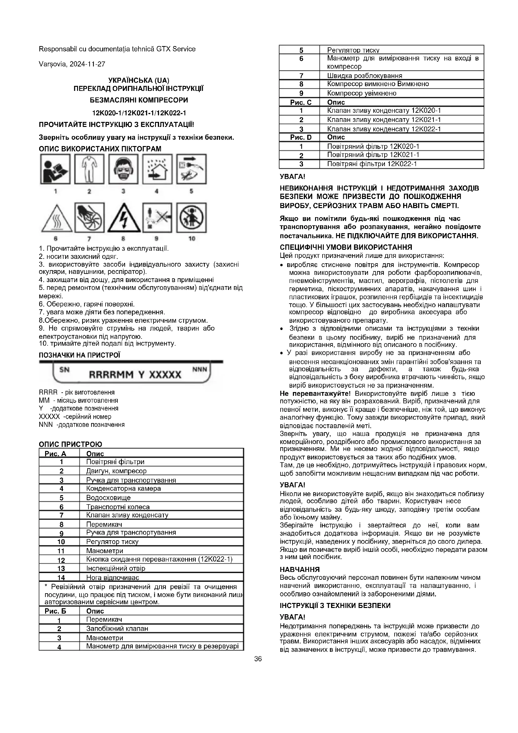 - Цей виріб розроблено відповідно до всіх застосовних вимог безпеки та стандартів, які до нього застосовуються. Будь-які ремонтні роботи повинні виконуватися тільки кваліфікованим фахівцем, а запасні частини замінюватися оригінальними, інакше користувач може наразитися на серйозну небезпеку. ІНСТРУКЦІЯ З ТЕХНІКИ БЕЗПЕКИ ПРИ РОБОТІ З КОМПРЕСОРОМ КЛАПАН СКИДАННЯ ТИСКУ В РЕЗЕРВУАРІ