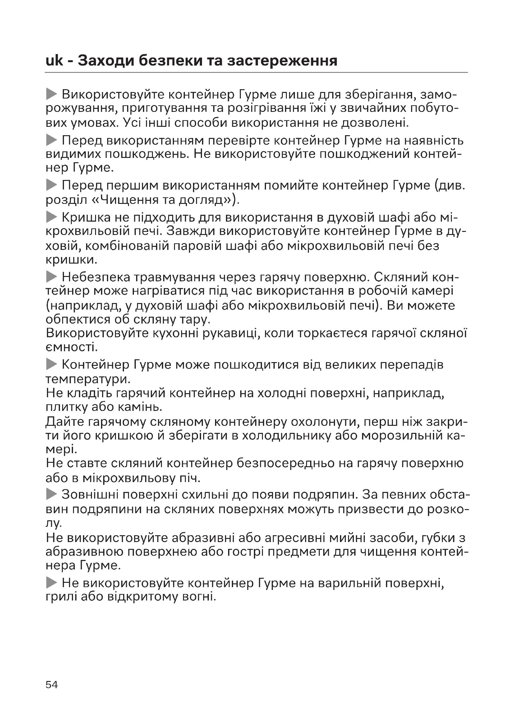 Контейнер Гурме може пошкодитися від великих перепадів температури. Не кладіть гарячий контейнер на холодні поверхні, наприклад, плитку або камінь. Дайте гарячому скляному контейнеру охолонути, перш ніж закри- ти його кришкою й зберігати в холодильнику або морозильній ка-