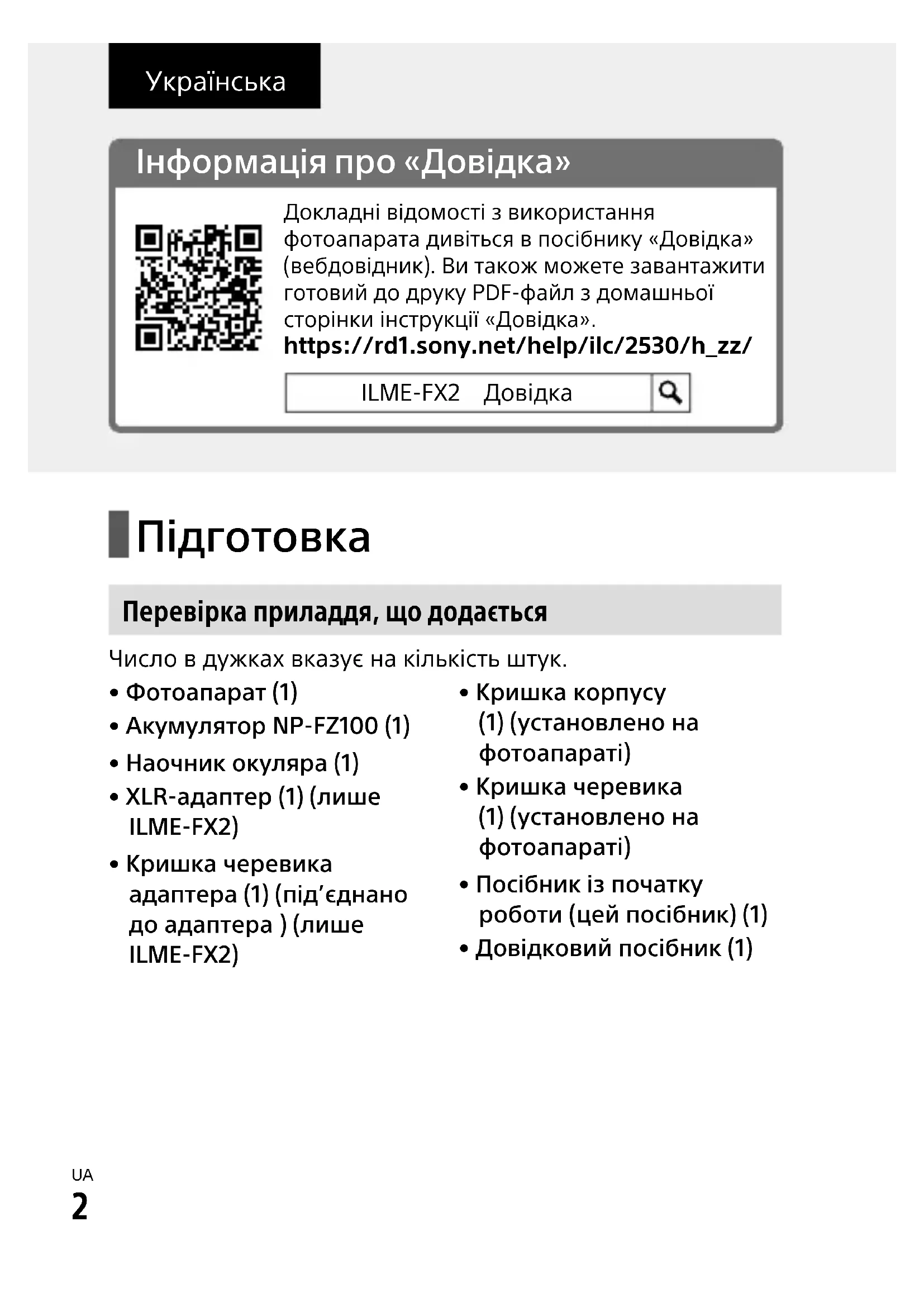 Перевірка приладдя, що додається Число в дужках вказує на кількість штук.• Фотоапарат (1)• Акумулятор NP-FZ100 (1)• Наочник окуляра (1) • XLR-адаптер (1) (лише ILME-FX2)• Кришка черевика адаптера (1) (під’єднано до адаптера ) (лише ILME-FX2)• Кришка корпусу (1) (установлено на фотоапараті)• Кришка черевика (1) (установлено на фотоапараті)• Посібник із початку роботи (цей посібник) (1)• Довідковий посібник (1)UA