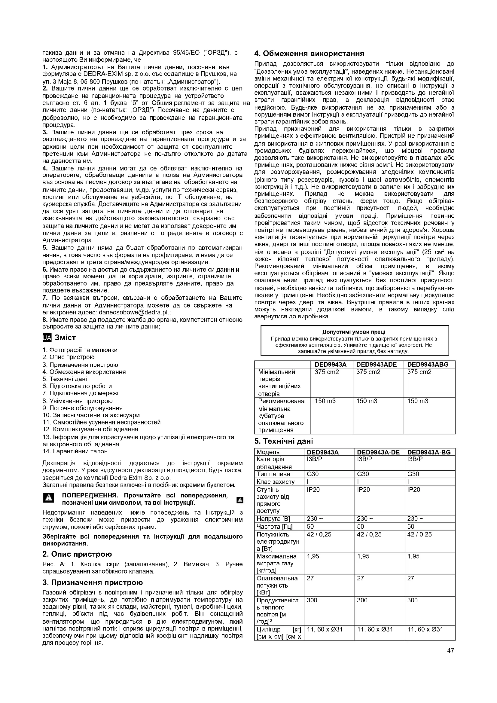 Цей виріб не можна використовувати як основне джерело опалення. Всі права захищені. Ця робота захищена авторським правом. Копіювання або розповсюдження Посібника користувача повністю або частково без дозволу Dedra Exim заборонено Dedra Exim залишає за собою право вносити зміни в конструкцію, технічні характеристики та комплектацію без попереднього повідомлення. Ці зміни не можуть бути підставою для реклами продукту. Посібник користувача доступний на сайті www.dedra.pl
