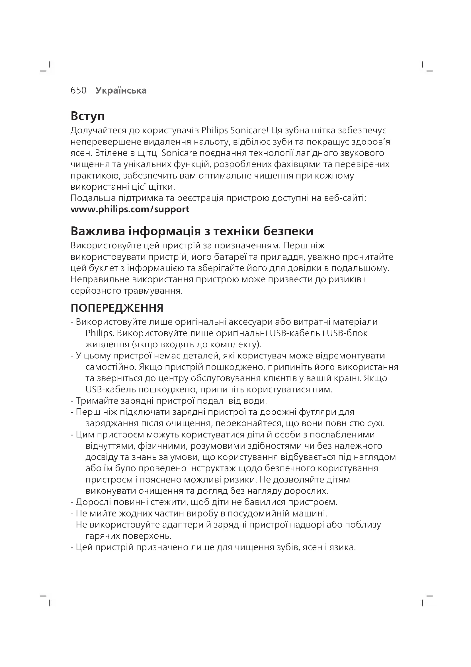Долучайтеся до користувачів Philips Sonicare! Ця зубна щітка забезпечує неперевершене видалення нальоту, відбілює зуби та покращує здоров’я ясен. Втілене в щітці Sonicare поєднання технології лагідного звукового чищення та унікальних функцій, розроблених фахівцями та перевірених практикою, забезпечить вам оптимальне чищення при кожному використанні цієї щітки. Подальша підтримка та реєстрація пристрою доступні на веб-сайті: www.philips.com/support Важлива інформація з техніки безпеки Використовуйте цей пристрій за призначенням. Перш ніж використовувати пристрій, його батареї та приладдя, уважно прочитайте цей буклет з інформацією та зберігайте його для довідки в подальшому. Неправильне використання пристрою може призвести до ризиків і серйозного травмування. ПОПЕРЕДЖЕННЯ - Використовуйте лише оригінальні аксесуари або витратні матеріали Philips. Використовуйте лише оригінальні USB-кабель і USB-блок живлення (якщо входять до комплекту). - У цьому пристрої немає деталей, які користувач може відремонтувати самостійно. Якщо пристрій пошкоджено, припиніть його використання та зверніться до центру обслуговування клієнтів у вашій країні. Якщо USB-кабель пошкоджено, припиніть користуватися ним. - Тримайте зарядні пристрої подалі від води. - Перш ніж підключати зарядні пристрої та дорожні футляри для заряджання після очищення, переконайтеся, що вони повністю сухі. - Цим пристроєм можуть користуватися діти й особи з послабленими відчуттями, фізичними, розумовими здібностями чи без належного досвіду та знань за умови, що користування відбувається під наглядом або їм було проведено інструктаж щодо безпечного користування пристроєм і пояснено можливі ризики. Не дозволяйте дітям виконувати очищення та догляд без нагляду дорослих. - Дорослі повинні стежити, щоб діти не бавилися пристроєм. - Не мийте жодних частин виробу в посудомийній машині. - Не використовуйте адаптери й зарядні пристрої надворі або поблизу гарячих поверхонь. - Цей пристрій призначено лише для чищення зубів, ясен і язика.651