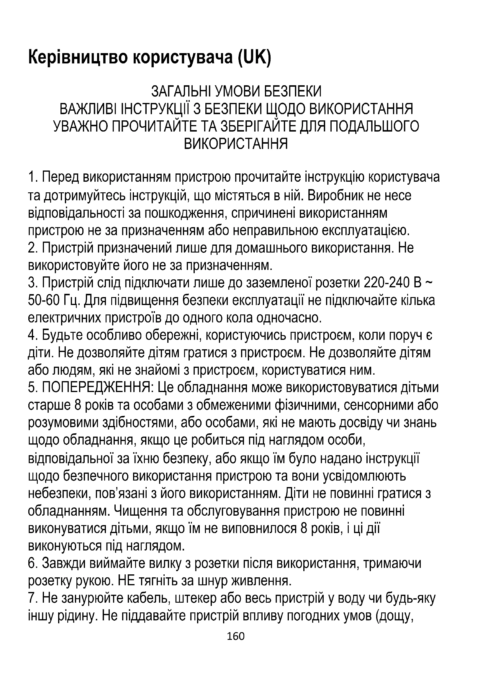 7. Не занурюйте кабель, штекер або весь пристрій у воду чи будь-яку