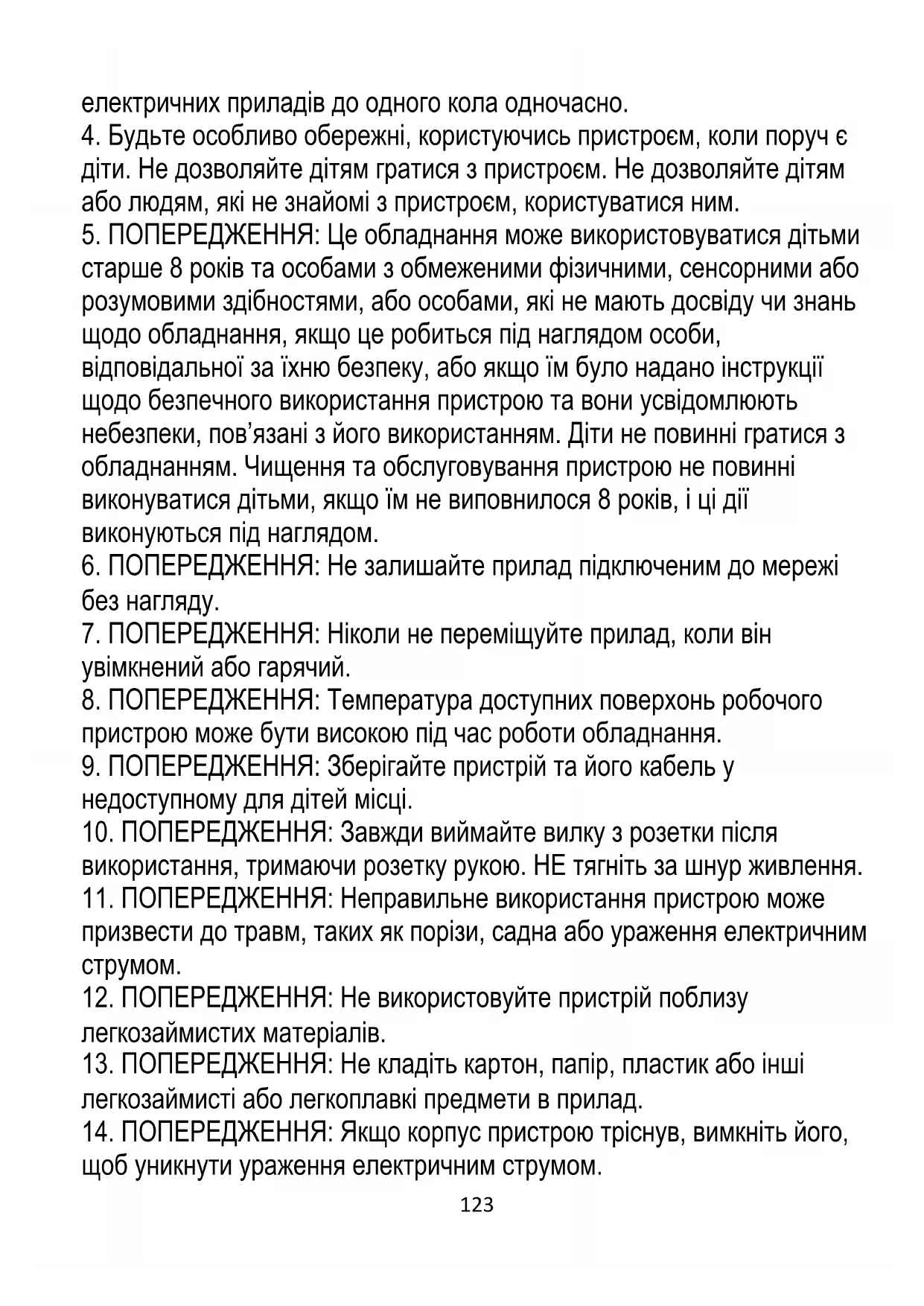50-60 Гц. Для підвищення безпеки експлуатації не підключайте кілька123 електричних приладів до одного кола одночасно.
