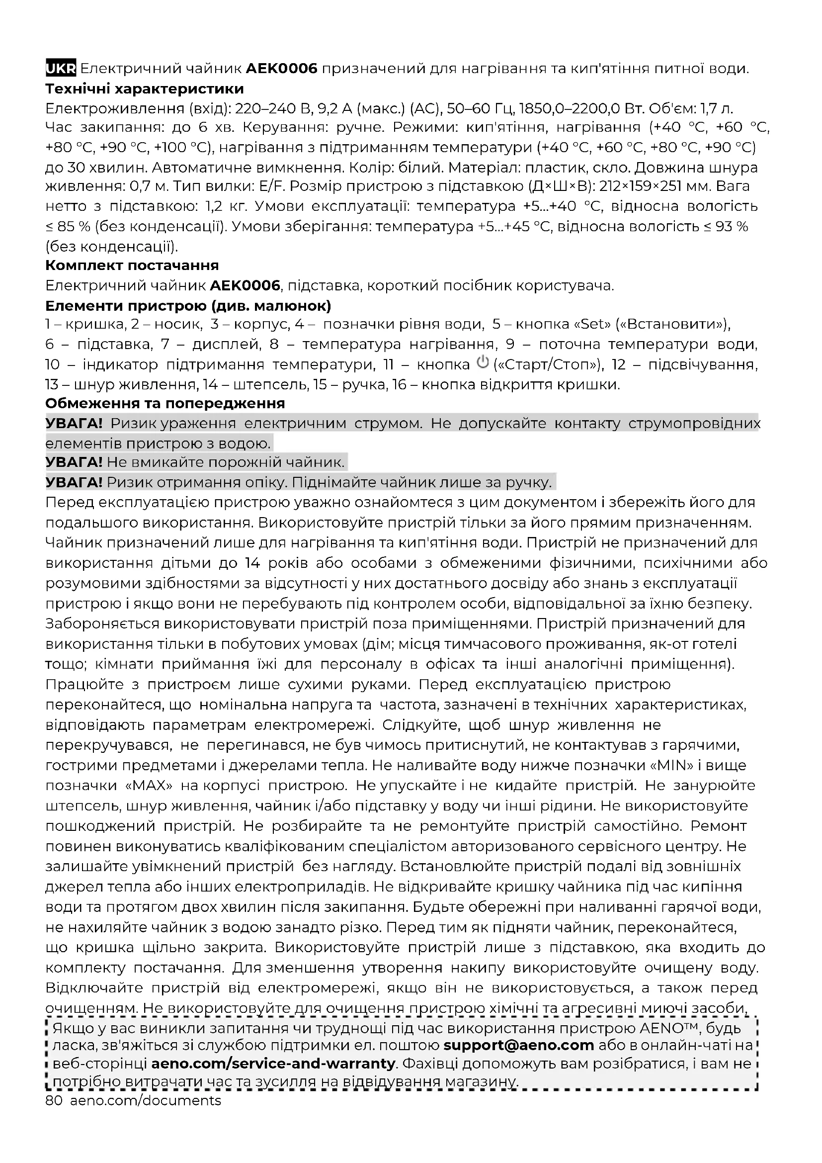 ASBISC zadržava pravo da modifikuјe uređaј i da unosi izmene i dopune u ovaj dokument bez prethodnog obaveštenja korisnika. Ovaј uređaј јe u skladu sa važećim bezbednosnim zahtevima. Garantni rok i upotrebni rok je 2 godine od datuma prodaјe proizvoda u maloprodaji. Podaci o proizvođaču: ASBISC Enterprises PLC, Iapetou, 1, Agios Athanasios, 4101, Limassol, Cyprus (Kipar). Tel.: +48732080077, e-pošta: info@asbis.com, asbis.com. Proizvedeno u Kini. Datum proizvodnje v. na pakovanju. Svi zaštitni znakovi i trgovačka imena pomenuta ovde su vlasništvo njihovih vlasnika. Ažurne informaciјe i detaljan opis uređaјa, kao i uputstva za povezivanje, sertifikati, informaciјe o društvima koјi primaјu reklamaciјe za kvalitet i garanciјe, dostupne su za preuzimanje na linku aeno.com/documents. Direktiva RoHS. Uređaј јe u skladu sa zahtevima Direktive RoHS 2011/65/EU o ograničenju upotrebe opasnih supstanci, uključuјući zahteve Direktive RoHS 2015/863/EU.80 aeno.com/documents UKR Електричний чайник AEK0006 призначений для нагрівання та кип'ятіння питної води. Технічні характеристики Електроживлення (вхід): 220–240 В, 9,2 А (макс.) (AC), 50–60 Гц, 1850,0–2200,0 Вт. Об'єм: 1,7 л. Час закипання: до 6 хв. Керування: ручне. Режими: кип'ятіння, нагрівання (+40 °C, +60 °C, +80 °C, +90 °C, +100 °C), нагрівання з підтриманням температури (+40 °C, +60 °C, +80 °C, +90 °C) до 30 хвилин. Автоматичне вимкнення. Колір: білий. Матеріал: пластик, скло. Довжина шнура живлення: 0,7 м. Тип вилки: E/F. Розмір пристрою з підставкою (Д×Ш×В): 212×159×251 мм. Вага нетто з підставкою: 1,2 кг. Умови експлуатації: температура +5…+40 °C, відносна вологість ≤ 85 % (без конденсації). Умови зберігання: температура +5…+45 °C, відносна вологість ≤ 93 % (без конденсації). Комплект постачання Електричний чайник AEK0006, підставка, короткий посібник користувача. Елементи пристрою (див. малюнок) 1 – кришка, 2 – носик, 3 – корпус, 4 – позначки рівня води, 5 – кнопка «Set» («Встановити»), 6 – підставка, 7 – дисплей, 8 – температура нагрівання, 9 – поточна температури води, 10 – індикатор підтримання температури, 11 – кнопка («Старт/Стоп»), 12 – підсвічування, 13 – шнур живлення, 14 – штепсель, 15 – ручка, 16 – кнопка відкриття кришки. Обмеження та попередження УВАГА! Ризик ураження електричним струмом. Не допускайте контакту струмопровідних елементів пристрою з водою. УВАГА! Не вмикайте порожній чайник. УВАГА! Ризик отримання опіку. Піднімайте чайник лише за ручку. Перед експлуатацією пристрою уважно ознайомтеся з цим документом і збережіть його для подальшого використання. Використовуйте пристрій тільки за його прямим призначенням. Чайник призначений лише для нагрівання та кип'ятіння води. Пристрій не призначений для використання дітьми до 14 років або особами з обмеженими фізичними, психічними або розумовими здібностями за відсутності у них достатнього досвіду або знань з експлуатації пристрою і якщо вони не перебувають під контролем особи, відповідальної за їхню безпеку. Забороняється використовувати пристрій поза приміщеннями. Пристрій призначений для використання тільки в побутових умовах (дім; місця тимчасового проживання, як-от готелі тощо; кімнати приймання їжі для персоналу в офісах та інші аналогічні приміщення). Працюйте з пристроєм лише сухими руками. Перед експлуатацією пристрою переконайтеся, що номінальна напруга та частота, зазначені в технічних характеристиках, відповідають параметрам електромережі. Слідкуйте, щоб шнур живлення не перекручувався, не перегинався, не був чимось притиснутий, не контактував з гарячими, гострими предметами і джерелами тепла. Не наливайте воду нижче позначки «MIN» і вище позначки «MAX» на корпусі пристрою. Не упускайте і не кидайте пристрій. Не занурюйте штепсель, шнур живлення, чайник і/або підставку у воду чи інші рідини. Не використовуйте