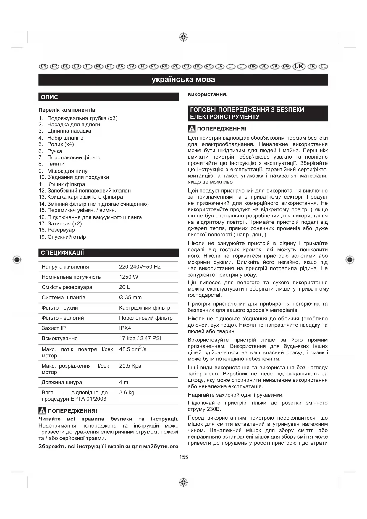 СПЕЦИФІКАЦІЇ Напруга живлення 220-240V~50 Hz Номінальна потужність 1250 W Ємкість резервуара 20 L Система шлангів Ø 35 mm Фільтр - сухий Картріджний фільтр Фільтр - вологий Поролоновий фільтр Захист IP IPX4 Всмоктування 17 kpa / 2.47 PSI Макс. потік повітря l/сек