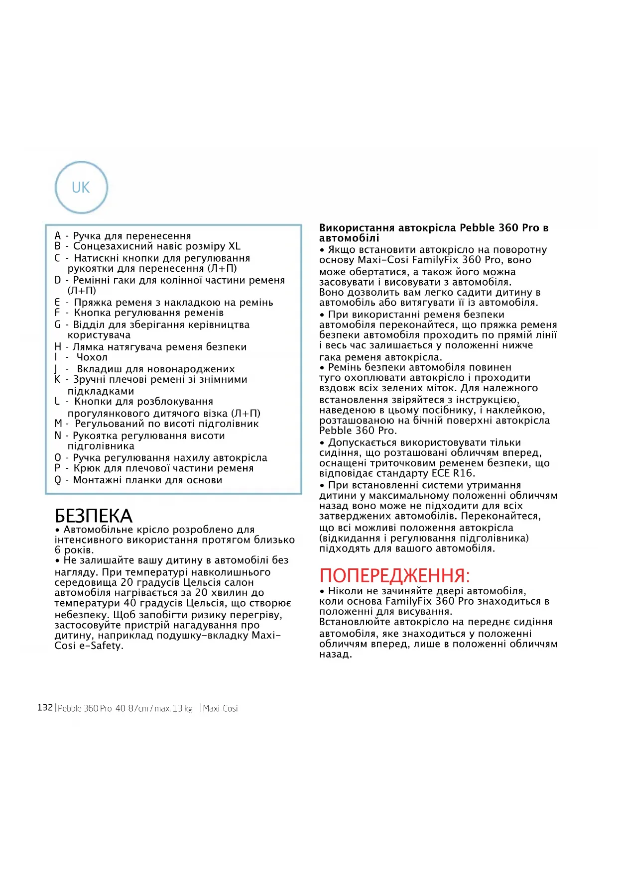 - Не залишайте вашу дитину в автомобілі без нагляду. При температурі навколишнього середовища 20 градусів Цельсія салон автомобіля нагрівається за 20 хвилин до температури 40 градусів Цельсія, що створює небезпеку. Щоб запобігти ризику перегріву, застосовуйте пристрій нагадування про дитину, наприклад подушку-вкладку Maxi- Cosi e-Safety. Використання автокрісла Pebble 360 Pro в