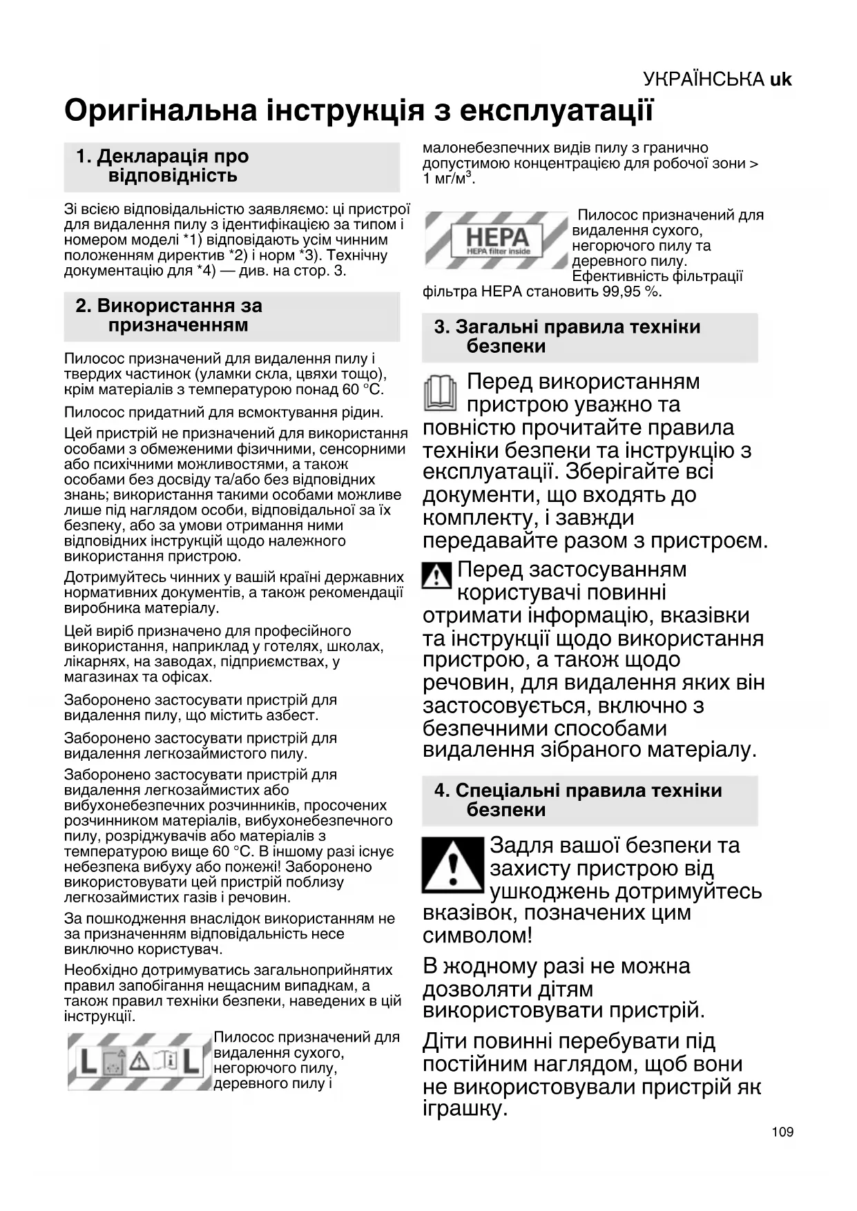 Оригінальна інструкція з експлуатації Зі всією відповідальністю заявляємо: ці пристрої для видалення пилу з ідентифікацією за типом і номером моделі *1) відповідають усім чинним положенням директив *2) і норм *3). Технічну документацію для *4) — див. на стор. 3. Пилосос призначений для видалення пилу і твердих частинок (уламки скла, цвяхи тощо), крім матеріалів з температурою понад 60 °C. Пилосос придатний для всмоктування рідин. Цей пристрій не призначений для використання особами з обмеженими фізичними, сенсорними або психічними можливостями, а також особами без досвіду та/або без відповідних знань; використання такими особами можливе лише під наглядом особи, відповідальної за їх безпеку, або за умови отримання ними відповідних інструкцій щодо належного використання пристрою. Дотримуйтесь чинних у вашій країні державних нормативних документів, а також рекомендації виробника матеріалу. Цей виріб призначено для професійного використання, наприклад у готелях, школах, лікарнях, на заводах, підприємствах, у магазинах та офісах. Заборонено застосувати пристрій для видалення пилу, що містить азбест. Заборонено застосувати пристрій для видалення легкозаймистого пилу. Заборонено застосувати пристрій для видалення легкозаймистих або вибухонебезпечних розчинників, просочених розчинником матеріалів, вибухонебезпечного пилу, розріджувачів або матеріалів з температурою вище 60 °C. В іншому разі існує небезпека вибуху або пожежі! Заборонено використовувати цей пристрій поблизу легкозаймистих газів і речовин. За пошкодження внаслідок використанням не за призначенням відповідальність несе виключно користувач. Необхідно дотримуватись загальноприйнятих правил запобігання нещасним випадкам, а також правил техніки безпеки, наведених в цій інструкції. Пилосос призначений для видалення сухого, негорючого пилу, деревного пилу і малонебезпечних видів пилу з гранично допустимою концентрацією для робочої зони > 1 мг/м³. Пилосос призначений для видалення сухого, негорючого пилу та деревного пилу. Ефективність фільтрації фільтра HEPA становить 99,95 %. Перед використанням пристрою уважно та повністю прочитайте правила техніки безпеки та інструкцію з експлуатації. Зберігайте всі документи, що входять до комплекту, і завжди передавайте разом з пристроєм. Перед застосуванням користувачі повинні отримати інформацію, вказівки та інструкції щодо використання пристрою, а також щодо речовин, для видалення яких він застосовується, включно з безпечними способами видалення зібраного матеріалу. Задля вашої безпеки та захисту пристрою від ушкоджень дотримуйтесь вказівок, позначених цим