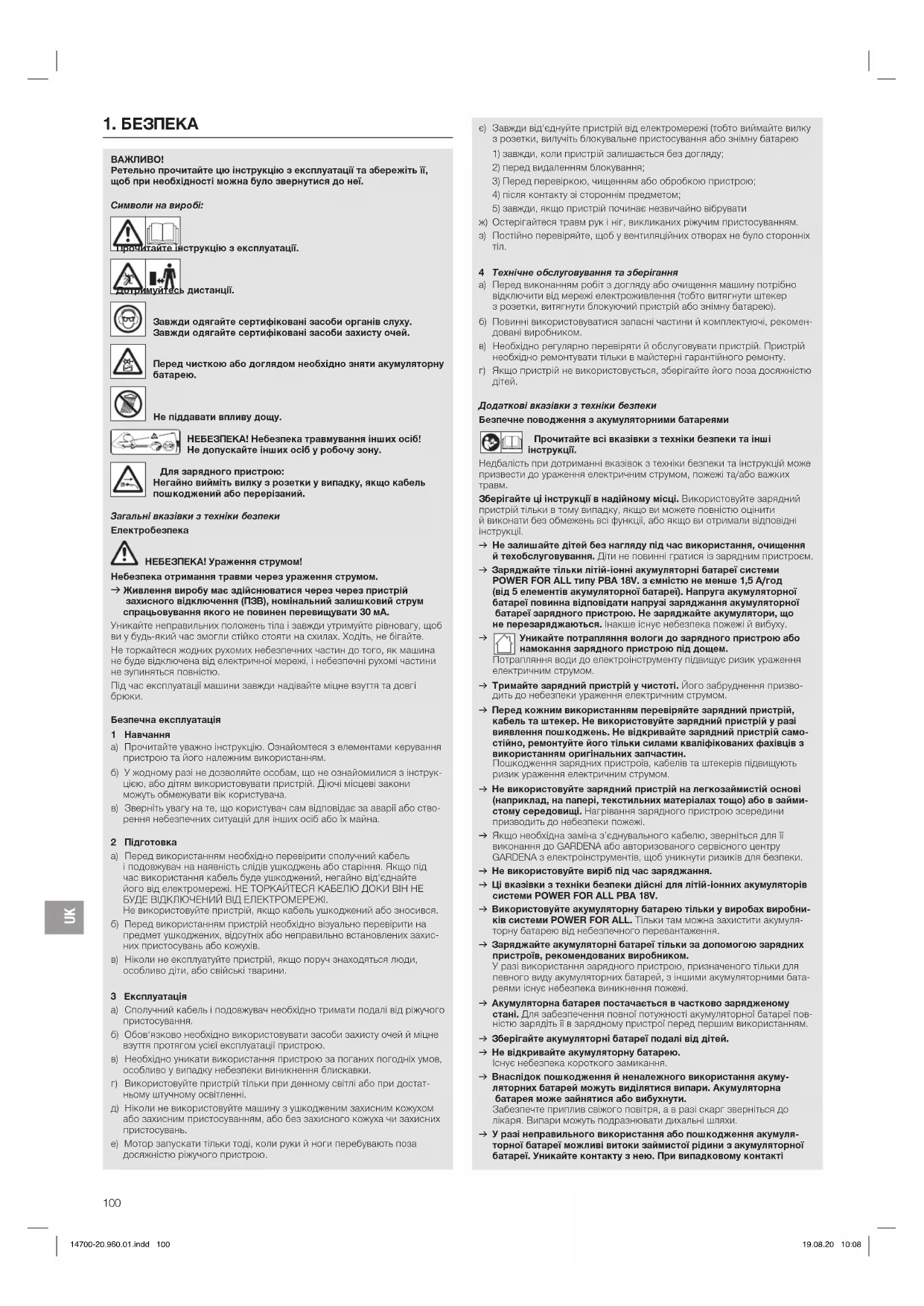 v Утилізуйте виріб у або за допомогою місцевого спеціалізованого збірного пункту з утилізації. Утилізація акумуляторної батареї: Li-ion Акумуляторна батарея GARDENA містить літій-іонні акумуляторні елементи, які після закінчення терміну їх служби не можна утилізувати як звичайне побутове