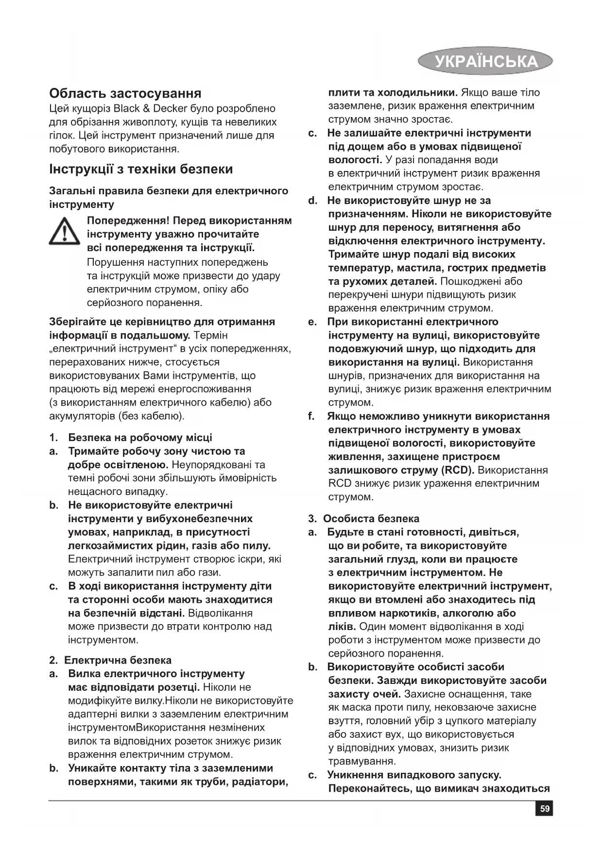 Область застосування Цей кущоріз Black & Decker було розроблено для обрізання живоплоту, кущів та невеликих гілок. Цей інструмент призначений лише для побутового використання. Інструкції з техніки безпеки Загальні правила безпеки для електричного інструменту Попередження! Перед використанням інструменту уважно прочитайте всі попередження та інструкції. Порушення наступних попереджень та інструкцій може призвести до удару електричним струмом, опіку або серйозного поранення. Зберігайте це керівництво для отримання інформації в подальшому. Термін „електричний інструмент“ в усіх попередженнях, перерахованих нижче, стосується використовуваних Вами інструментів, що працюють від мережі енергоспоживання (з використанням електричного кабелю) або акумуляторів (без кабелю).