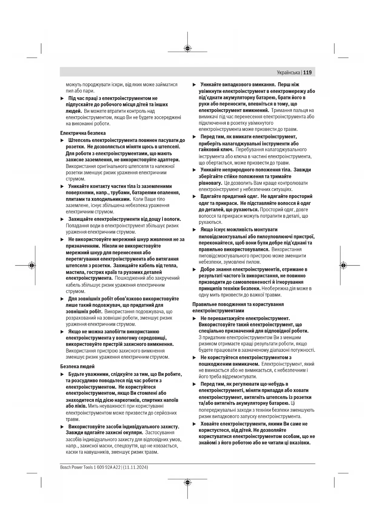 u Якщо існує можливість монтувати пиловідсмоктувальні або пилоуловлюючі пристрої, переконайтеся, щоб вони були добре під’єднані та правильно використовувалися. Використання пиловідсмоктувального пристрою може зменшити небезпеки, зумовлені пилом. u Добре знання електроінструментів, отримане в результаті частого їх використання, не повинно призводити до самовпевненості й ігнорування принципів техніки безпеки. Необережна дія може в одну мить призвести до важкої травми. Правильне поводження та користування електроінструментами u Не перевантажуйте електроінструмент. Використовуйте такий електроінструмент, що спеціально призначений для відповідної роботи. Зпридатним електроінструментом Ви з меншим ризиком отримаєте кращі результати роботи, якщо будете працювати в зазначеному діапазоні потужності. u Не користуйтеся електроінструментом з пошкодженим вимикачем. Електроінструмент, який не вмикається або не вимикається, є небезпечним і його треба відремонтувати. u Перед тим, як регулювати що-небудь в електроінструменті, міняти приладдя або ховати електроінструмент, витягніть штепсель із розетки та/або витягніть акумуляторну батарею. Ці попереджувальні заходи з техніки безпеки зменшують ризик випадкового запуску електроінструмента. u Ховайте електроінструменти, якими Ви саме не користуєтеся, від дітей. Не дозволяйте користуватися електроінструментом особам, що не знайомі з його роботою або не читали ці вказівки. Bosch Power Tools 1 609 92A A22 | (11.11.2024)120 | Українська Використання електроінструментів недосвідченими особами може бути небезпечним. u Старанно доглядайте за електроінструментами і приладдям. Перевіряйте, щоб рухомі деталі електроінструмента були правильно розташовані та не заїдали, не були пошкодженими або у будь- якому іншому стані, який міг би вплинути на функціонування електроінструмента. Пошкоджені електроінструменти потрібно відремонтувати, перш ніж користуватися ними знову. Велика кількість нещасних випадків спричиняється поганим доглядом за електроінструментами. u Тримайте різальні інструменти нагостреними та в чистоті. Старанно доглянуті різальні інструменти з гострим різальним краєм менше застряють та легші в експлуатації. u Використовуйте електроінструмент, приладдя до нього, робочі інструменти тощо відповідно до цих вказівок. Беріть до уваги при цьому умови роботи та специфіку виконуваної роботи. Використання електроінструментів для робіт, для яких вони не передбачені, може призвести до небезпечних