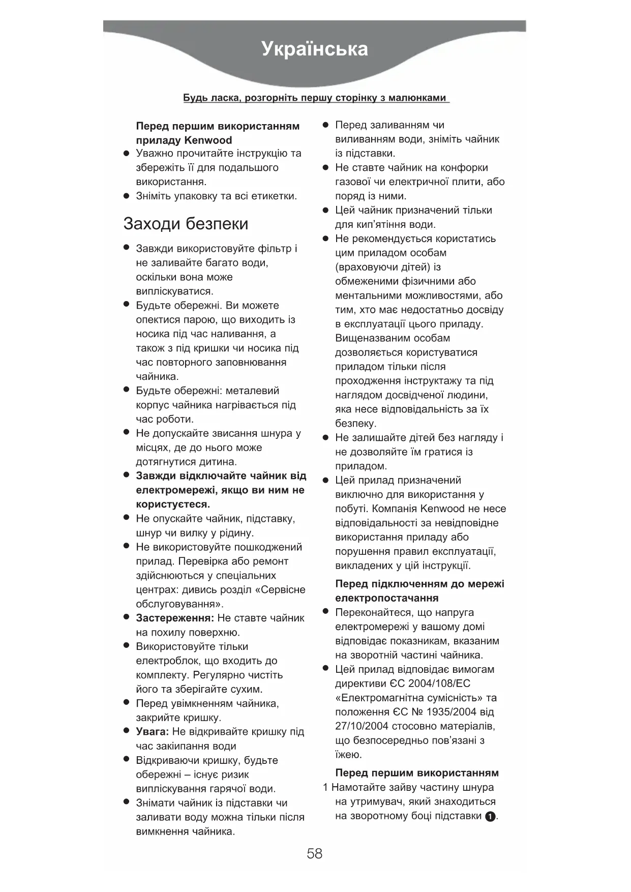 Цей прилад призначений виключно для використання у побуті. Компанія Kenwood не несе відповідальності за невідповідне використання приладу або порушення правил експлуатації, викладених у цій інструкції. Перед підключенням до мережі електропостачання
