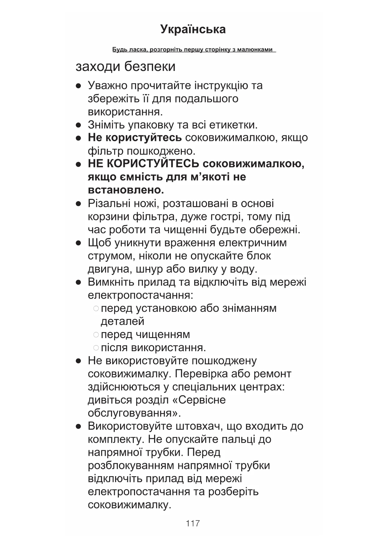 Використовуйте штовхач, що входить до комплекту. Не опускайте пальці до напрямної трубки. Перед розблокуванням напрямної трубки відключіть прилад від мережі електропостачання та розберіть соковижималку.