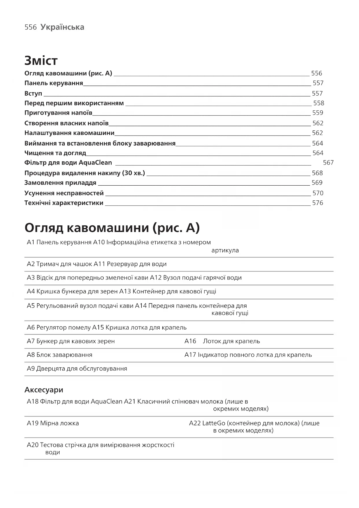Огляд кавомашини (рис.A) _____________________________________________________________ 556Панель керування_______________________________________________________________________ 557Вступ ___________________________________________________________________________________ 557Перед першим використанням __________________________________________________________ 558Приготування напоїв____________________________________________________________________ 559Створення власних напоїв_______________________________________________________________ 562Налаштування кавомашини_____________________________________________________________ 562Виймання та встановлення блоку заварювання__________________________________________ 564Чищення та догляд______________________________________________________________________ 564 Фільтр для води AquaClean _____________________________________________________________ 567 Процедура видалення накипу (30хв.) ___________________________________________________ 568Замовлення приладдя __________________________________________________________________ 569Усунення несправностей ________________________________________________________________ 570Технічні характеристики ________________________________________________________________ 576 Огляд кавомашини (рис.A) A1 Панель керування A10 Інформаційна етикетка з номеромартикулаA2 Тримач для чашок A11 Резервуар для водиA3 Відсік для попередньо змеленої кави A12 Вузол подачі гарячої водиA4 Кришка бункера для зерен A13 Контейнер для кавової гущіA5 Регульований вузол подачі кави A14 Передня панель контейнера длякавової гущіA6 Регулятор помелу A15 Кришка лотка для крапельA7 Бункер для кавових зерен A16 Лоток для крапельA8 Блок заварювання A17 Індикатор повного лотка для крапельA9 Дверцята для обслуговування A18 Фільтр для води AquaClean A21 Класичний спінювач молока (лише вокремих моделях)A19 Мірна ложка A22 LatteGo (контейнер для молока) (лишев окремих моделях)A20 Тестова стрічка для вимірювання жорсткості води557