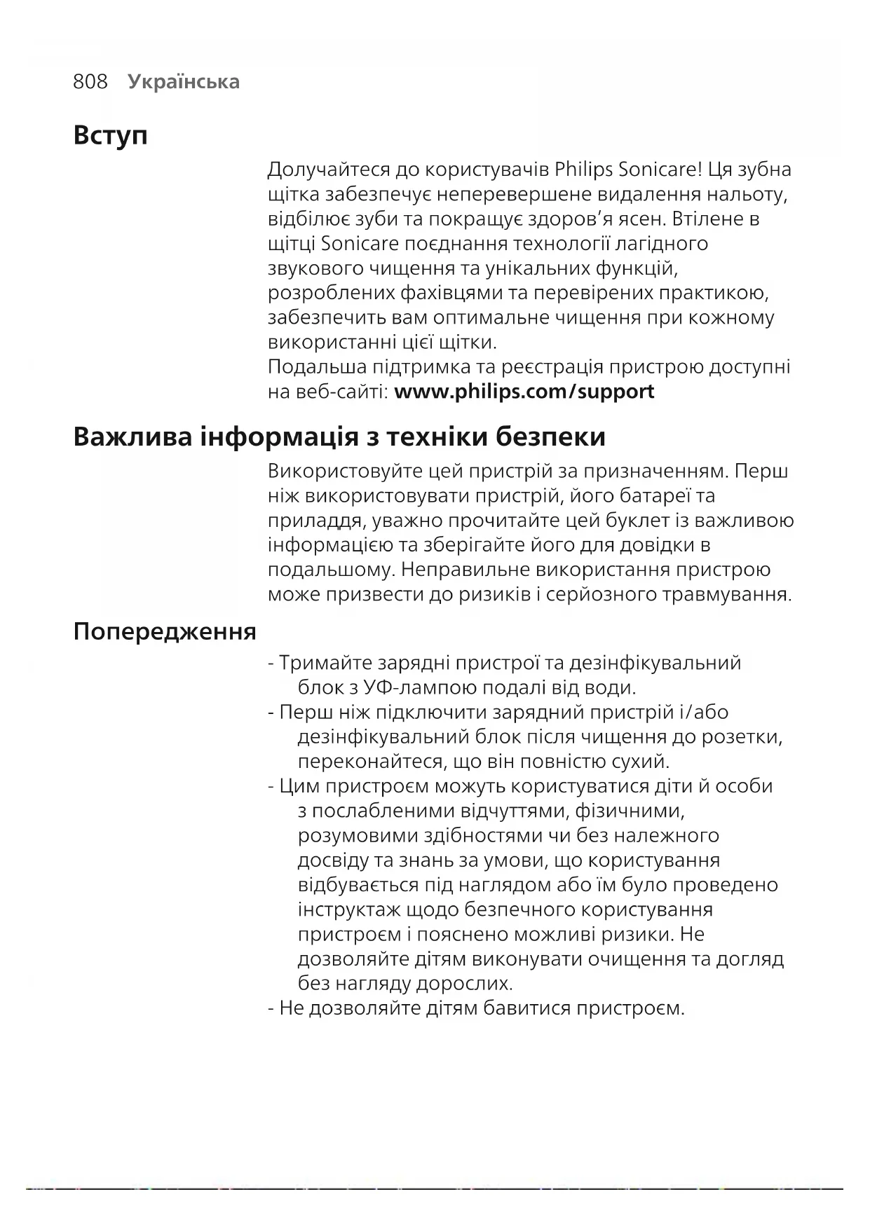 Долучайтеся до користувачів Philips Sonicare! Ця зубна щітка забезпечує неперевершене видалення нальоту, відбілює зуби та покращує здоров’я ясен. Втілене в щітці Sonicare поєднання технології лагідного звукового чищення та унікальних функцій, розроблених фахівцями та перевірених практикою, забезпечить вам оптимальне чищення при кожному використанні цієї щітки. Подальша підтримка та реєстрація пристрою доступні на веб-сайті: www.philips.com/support Важлива інформація з техніки безпеки Використовуйте цей пристрій за призначенням. Перш ніж використовувати пристрій, його батареї та приладдя, уважно прочитайте цей буклет із важливою інформацією та зберігайте його для довідки в подальшому. Неправильне використання пристрою може призвести до ризиків і серйозного травмування. Попередження - Тримайте зарядні пристрої та дезінфікувальний блок з УФ-лампою подалі від води. - Перш ніж підключити зарядний пристрій і/або дезінфікувальний блок після чищення до розетки, переконайтеся, що він повністю сухий. - Цим пристроєм можуть користуватися діти й особи з послабленими відчуттями, фізичними, розумовими здібностями чи без належного досвіду та знань за умови, що користування відбувається під наглядом або їм було проведено інструктаж щодо безпечного користування пристроєм і пояснено можливі ризики. Не дозволяйте дітям виконувати очищення та догляд без нагляду дорослих. - Не дозволяйте дітям бавитися пристроєм.809
