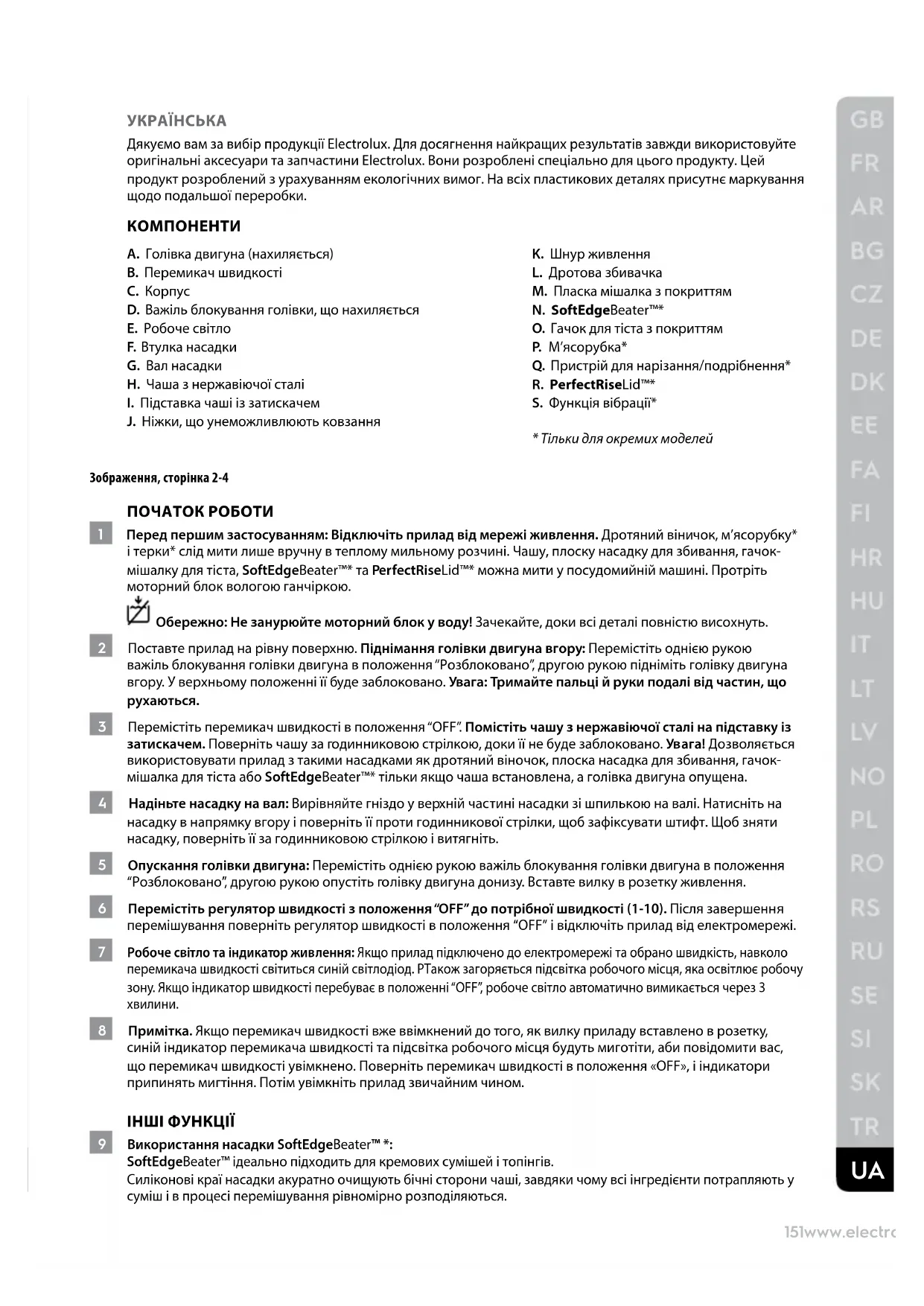 8 Примітка. Якщо перемикач швидкості вже ввімкнений до того, як вилку приладу вставлено в розетку, синій індикатор перемикача швидкості та підсвітка робочого місця будуть миготіти, аби повідомити вас, що перемикач швидкості увімкнено. Поверніть перемикач швидкості в положення «OFF», і індикатори припинять мигтіння. Потім увімкніть прилад звичайним чином. ІНШІ ФУНКЦІЇ 9 Використання насадки SoftEdgeBeater™ *: SoftEdgeBeater™ ідеально підходить для кремових сумішей і топінгів. Силіконові краї насадки акуратно очищують бічні сторони чаші, завдяки чому всі інгредієнти потрапляють у суміш і в процесі перемішування рівномірно розподіляються.152 www.electrolux.com 10 Примітка. Насадка SoftEdgeBeater™* не призначена для збивання щільних сумішей, таких як тісто, для цього використовуйте спеціальний гачок-мішалку для тіста. Для твердих інгредієнтів, таких як сухофрукти, шкірки або кістки використовуйте плоску насадку для збивання. 11 ВикористанняPerfectRiseLid™*: PerfectRiseLid ™ ізолює і допомагає створити вологе середовище, аби тісто піднялося до необхідного рівня. Накриваючи чашу кришкою PerfectRiseLid™ ви запобігаєте висиханню тіста і утворенню засохлої шкірки на поверхні тіста, яка заважає тісту піднятися і погіршує результат випікання. 12 Функція вібрації*: Якщо швидкість приладу встановлена на 1/P, можна тимчасово зупинити прилад, натиснувши кнопку «PULSE» на перемикачі швидкості. Повторне натиснення цієї кнопки запустить прилад на 1,5 секунди. При постійному натисненні прилад працюватиме доти, доки ви тримаєте кнопку натисненою. 13 Втулка насадки: Прилад постачається зі вбудованою багатофункціональною втулкою для насадки. Прочитайте й ретельно виконайте вказівки, що постачаються з кожною насадкою, для правильного й безпечного використання. 14 Регулювання валу насадки: Прилад налаштовано на заводі таким чином, що пласка мішалка дістає до дна чаші. Якщо пласка мішалка дряпає дно чаші або не дістає до її боків, її можна відрегулювати. Див. пункт 14 для отримання подальших інструкцій. 15 Поверніть регулятор швидкості в положення “OFF” і відключіть прилад від електромережі. Підніміть голівку двигуна. За допомогою викрутки з пласким лезом налаштуйте гвинт. Повертайте його за проти годинникової стрілки, щоб підняти вал насадки, та за годинниковою стрілкою, щоб опустити його. ЯК КОРИСТУВАТИСЯ М’ЯСОРУБКОЮ* 16 Вставте гвинт м’ясорубки (B) в корпус м’ясорубки (A). Встановіть ніж (C) на квадратний вал на кінці гвинта м’ясорубки. Встановіть пластину для помелу (D) (середнього або грубого) на ніж. Затягніть кільце (E) вручну до фіксації м’ясорубки в зборі. Примітка. Не затягуйте кільце занадто сильно. 17 Відкрийте кришку втулки насадки на міксері. Встановіть вал приводу насадки в паз втулки насадки на міксері. За необхідності обертайте насадку назад-вперед. Затягніть ручку втулки насадки до повної фіксації насадки. Увага! Перед приєднанням аксесуарів вимкніть прилад та витягніть вилку з розетки. 18 Встановіть лоток для продуктів на корпус м’ясорубки. Поріжте сире м’ясо на маленькі шматочки та покладіть на лоток для продуктів. Вставте вилку приладу в розетку и поверніть перемикач швидкості на швидкість 6-8. Подавайте м’ясо у колону подачі за допомогою товкача. Увага! Не кладіть пальці чи інші прилади в колону подачі. Примітка. М’ясо не повинно містити кісток, м’язів і шкіри. ЯК КОРИСТУВАТИСЯ П