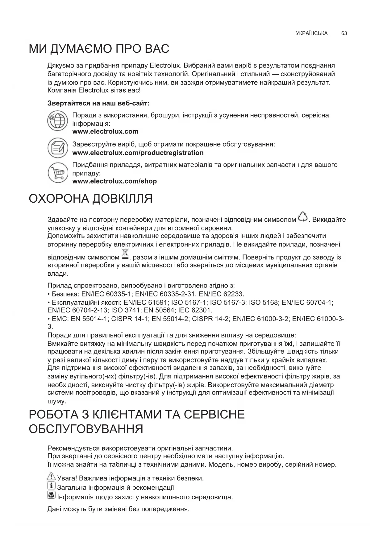 РОБОТА З КЛІЄНТАМИ ТА СЕРВІСНЕ ОБСЛУГОВУВАННЯ Рекомендується використовувати оригінальні запчастини. При звертанні до сервісного центру необхідно мати наступну інформацію. Її можна знайти на табличці з технічними даними. Модель, номер виробу, серійний номер. Увага! Важлива інформація з техніки безпеки. Загальна інформація й рекомендації Інформація щодо захисту навколишнього середовища. Дані можуть бути змінені без попередження. UK ІН