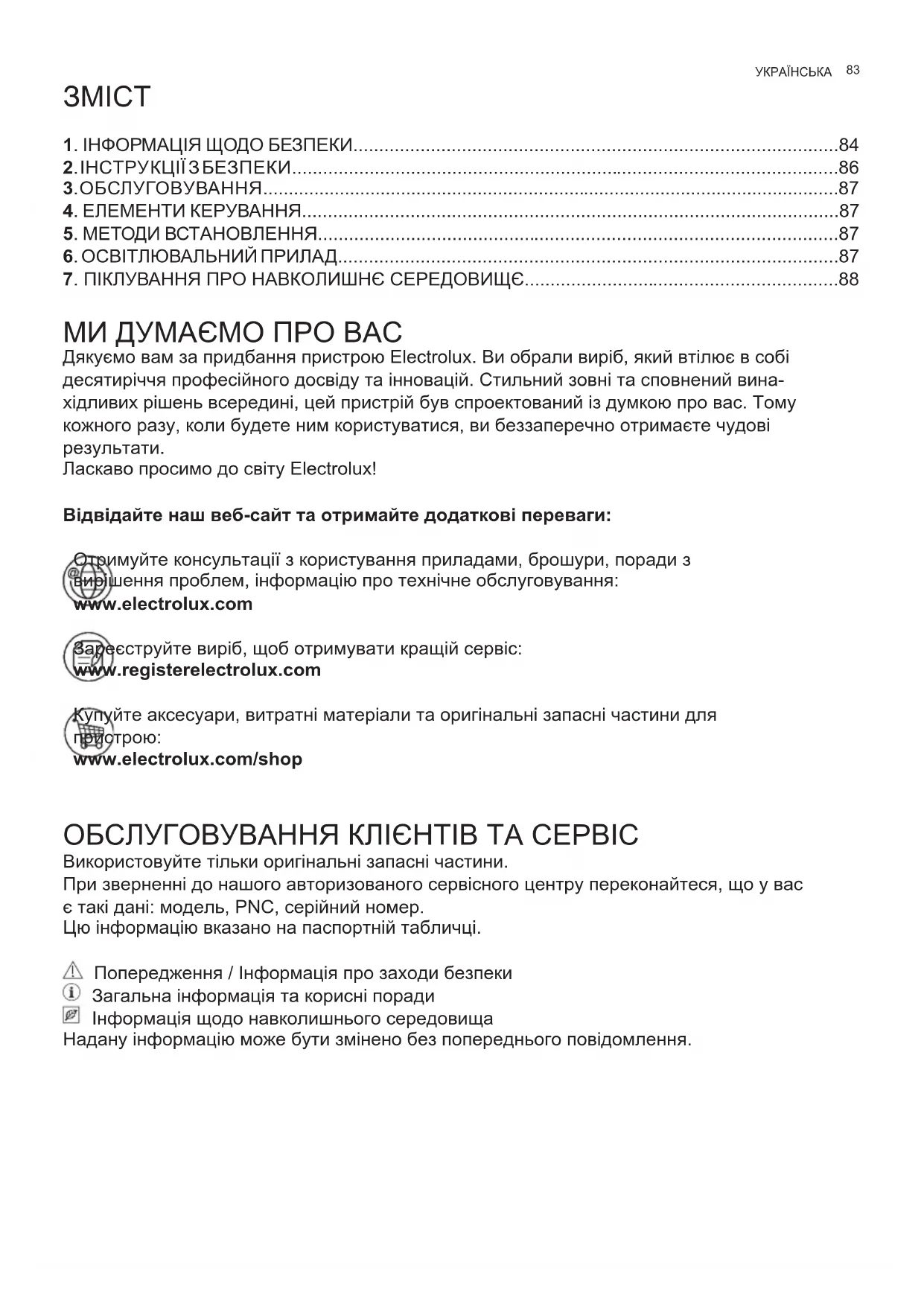 www.electrolux.com/shop ОБСЛУГОВУВАННЯ КЛІЄНТІВ ТА СЕРВІС Використовуйте тільки оригінальні запасні частини. При зверненні до нашого авторизованого сервісного центру переконайтеся, що у вас є такі дані: модель, PNC, серійний номер. Цю інформацію вказано на паспортній табличці. Попередження / Інформація про заходи безпеки Загальна інформація та корисні поради Інформація щодо навколишнього середовища Надану інформацію може бути змінено без попереднього повідомлення. УКРАЇНСЬКА84 www.electrolux.com