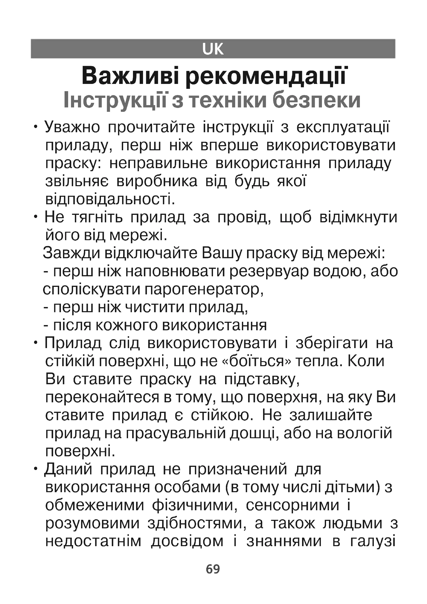 - Уважно прочитайте інструкції з експлуатації приладу, перш ніж вперше використовувати праску: неправильне використання приладу звільняє виробника від будь якої відповідальності.