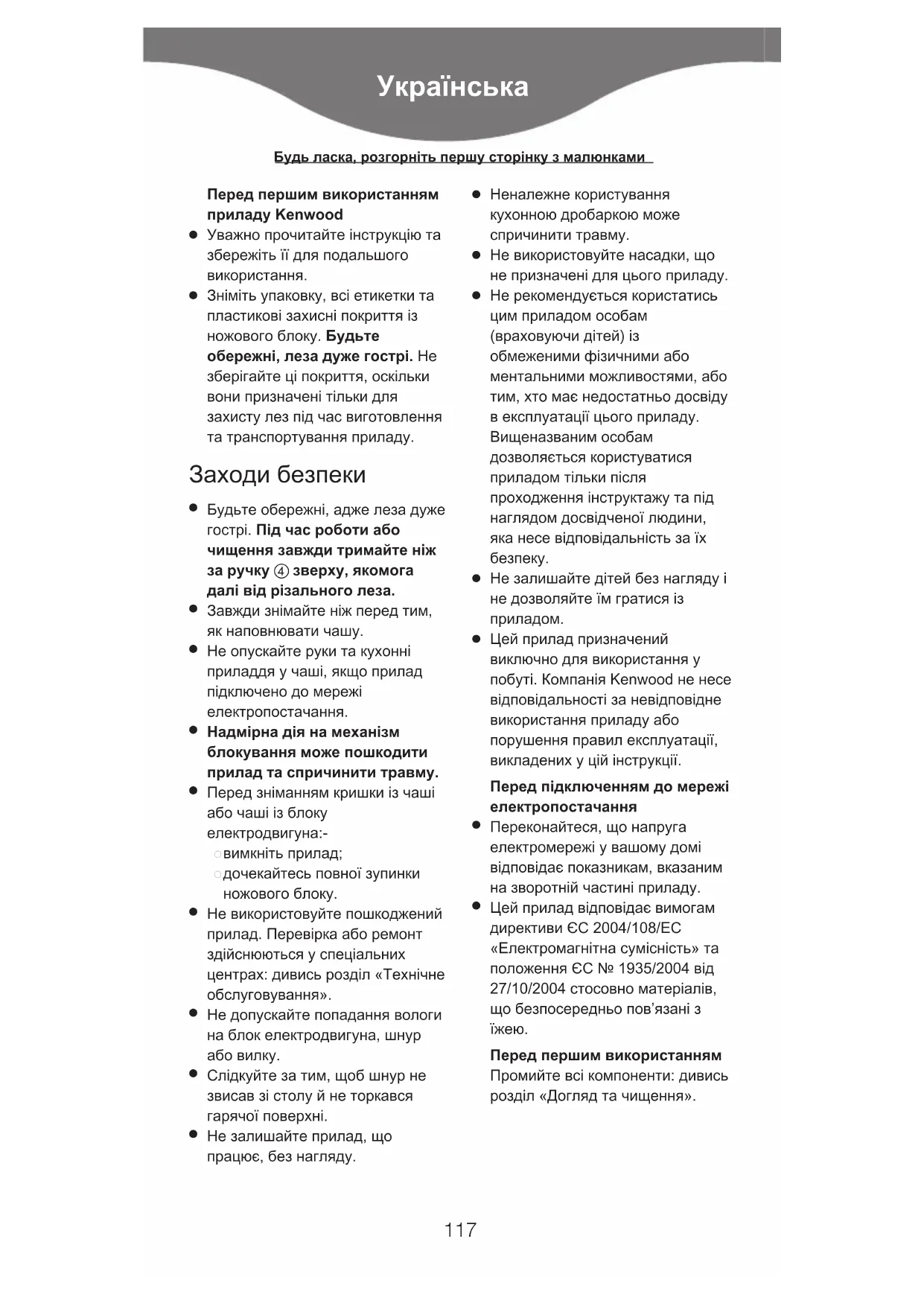 Цей прилад призначений виключно для використання у побуті. Компанія Kenwood не несе відповідальності за невідповідне використання приладу або порушення правил експлуатації, викладених у цій інструкції. Перед підключенням до мережі електропостачання
