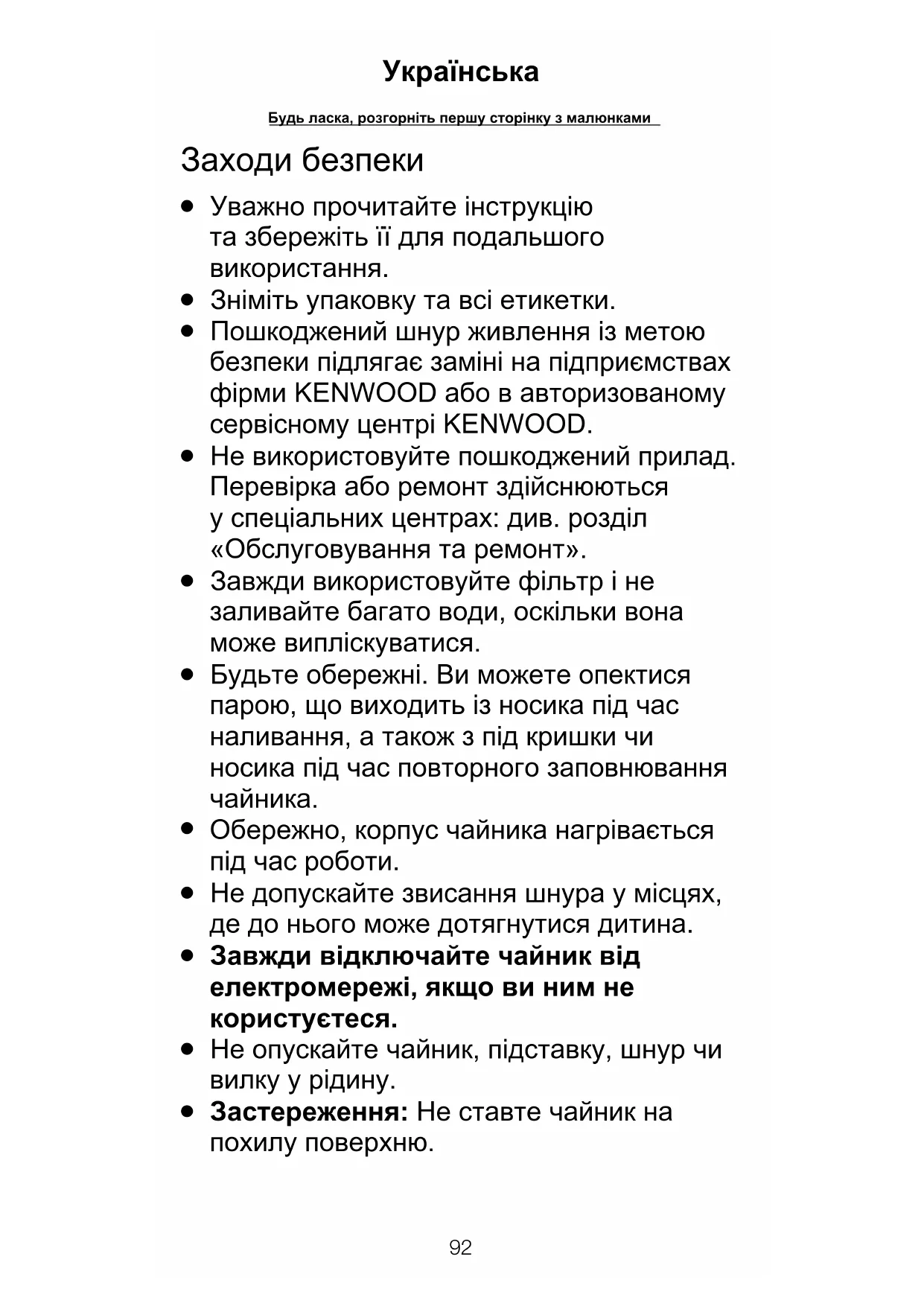 Цей прилад призначений виключно для використання у побуті. Компанія Kenwood не несе відповідальності за невідповідне використання приладу або порушення правил експлуатації, викладених у цій інструкції.Увага – Щоби перервати процес кип’ятіння, пересуньте перемикач у положення «вимкнути», і тільки після цього можна знімати прилад з