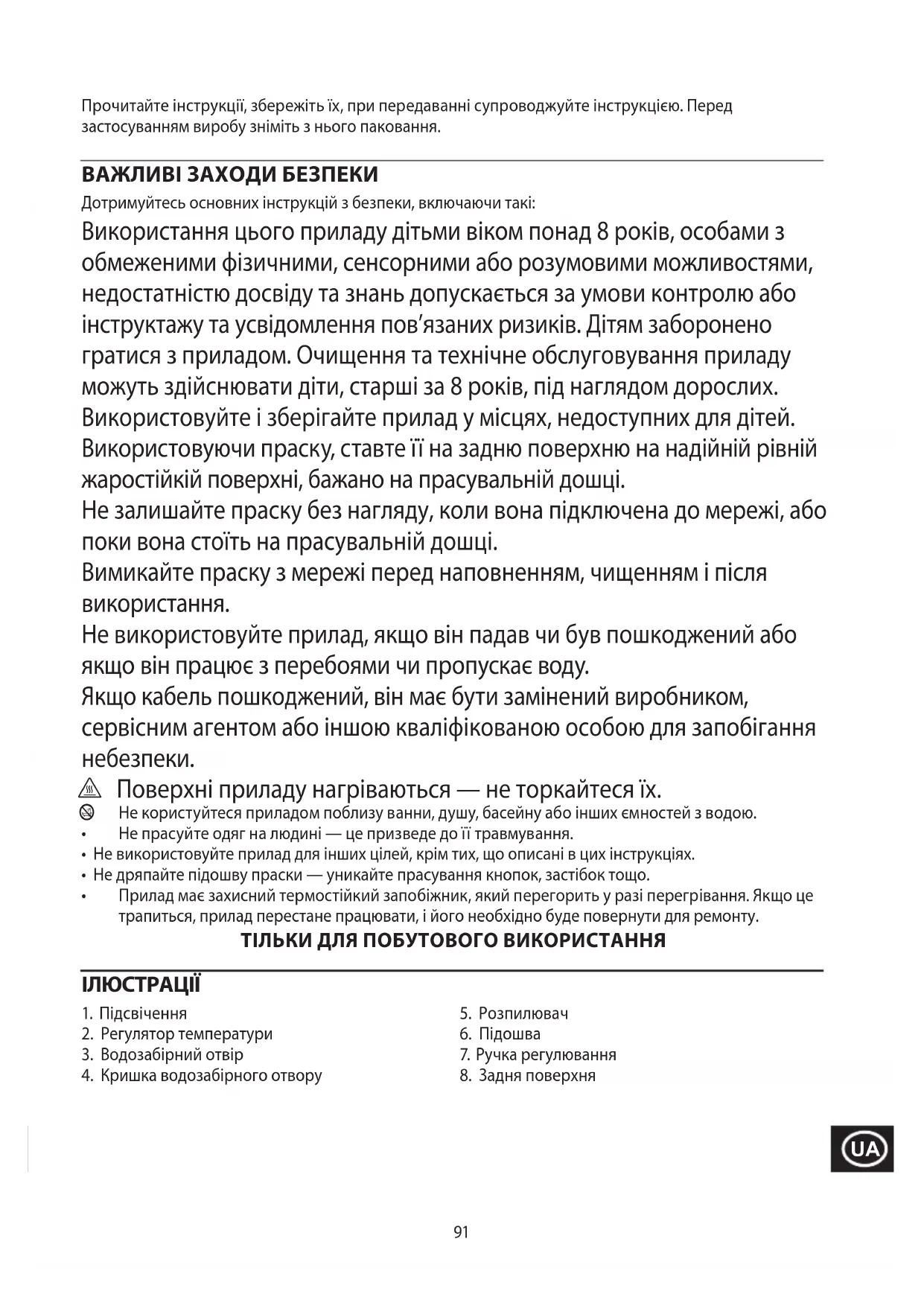 За да се избегнат екологични и здравни проблеми поради наличие на опасни субстанции, уредите, акумулаторните и неакумулаторните батерии, обозначени с един от тези символи, не трябва да се изхвърлят заедно с несортирани общински отпадъци. Винаги изхвърляйте електрически и електронни продукти и, където е приложимо, акумулаторни и неакумулаторни батерии, на подходящо официално място за рециклиране/събиране.91 Прочитайте інструкції, збережіть їх, при передаванні супроводжуйте інструкцією. Перед застосуванням виробу зніміть з нього паковання. ВАЖЛИВІ ЗАХОДИ БЕЗПЕКИ Дотримуйтесь основних інструкцій з безпеки, включаючи такі: Використання цього приладу дітьми віком понад 8 років, особами з обмеженими фізичними, сенсорними або розумовими можливостями, недостатністю досвіду та знань допускається за умови контролю або інструктажу та усвідомлення пов’язаних ризиків. Дітям заборонено гратися з приладом. Очищення та технічне обслуговування приладу можуть здійснювати діти, старші за 8 років, під наглядом дорослих. Використовуйте і зберігайте прилад у місцях, недоступних для дітей. Використовуючи праску, ставте її на задню поверхню на надійній рівній жаростійкій поверхні, бажано на прасувальній дошці. Не залишайте праску без нагляду, коли вона підключена до мережі, або поки вона стоїть на прасувальній дошці. Вимикайте праску з мережі перед наповненням, чищенням і після використання. Не використовуйте прилад, якщо він падав чи був пошкоджений або якщо він працює з перебоями чи пропускає воду. Якщо кабель пошкоджений, він має бути замінений виробником, сервісним агентом або іншою кваліфікованою особою для запобігання