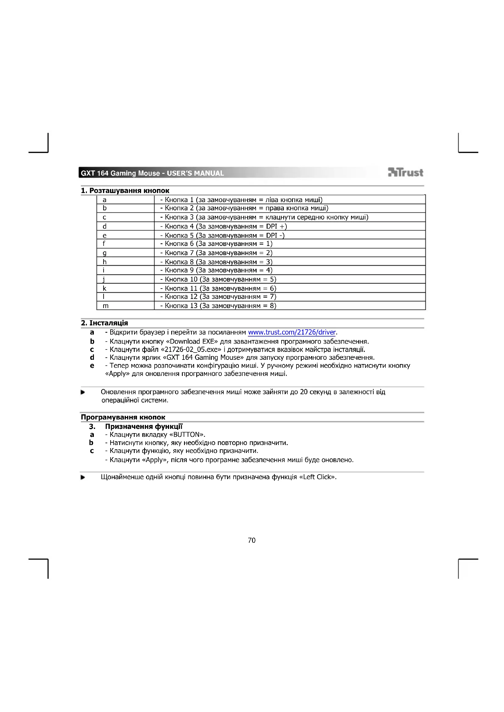 - Відкрити браузер і перейти за посиланням www.trust.com/21726/driver. - Клацнути кнопку «Download EXE» для завантаження програмного забезпечення. - Клацнути файл «21726-02_05.exe» і дотримуватися вказівок майстра інсталяції. - Клацнути ярлик «GXT 164 Gaming Mouse» для запуску програмного забезпечення. - Тепер можна розпочинати конфігурацію миші. У ручному режимі необхідно натиснути кнопку «Apply» для оновлення програмного забезпечення миші. Оновлення програмного забезпечення миші може зайняти до 20 секунд в залежності від операційної системи. Програмування кнопок