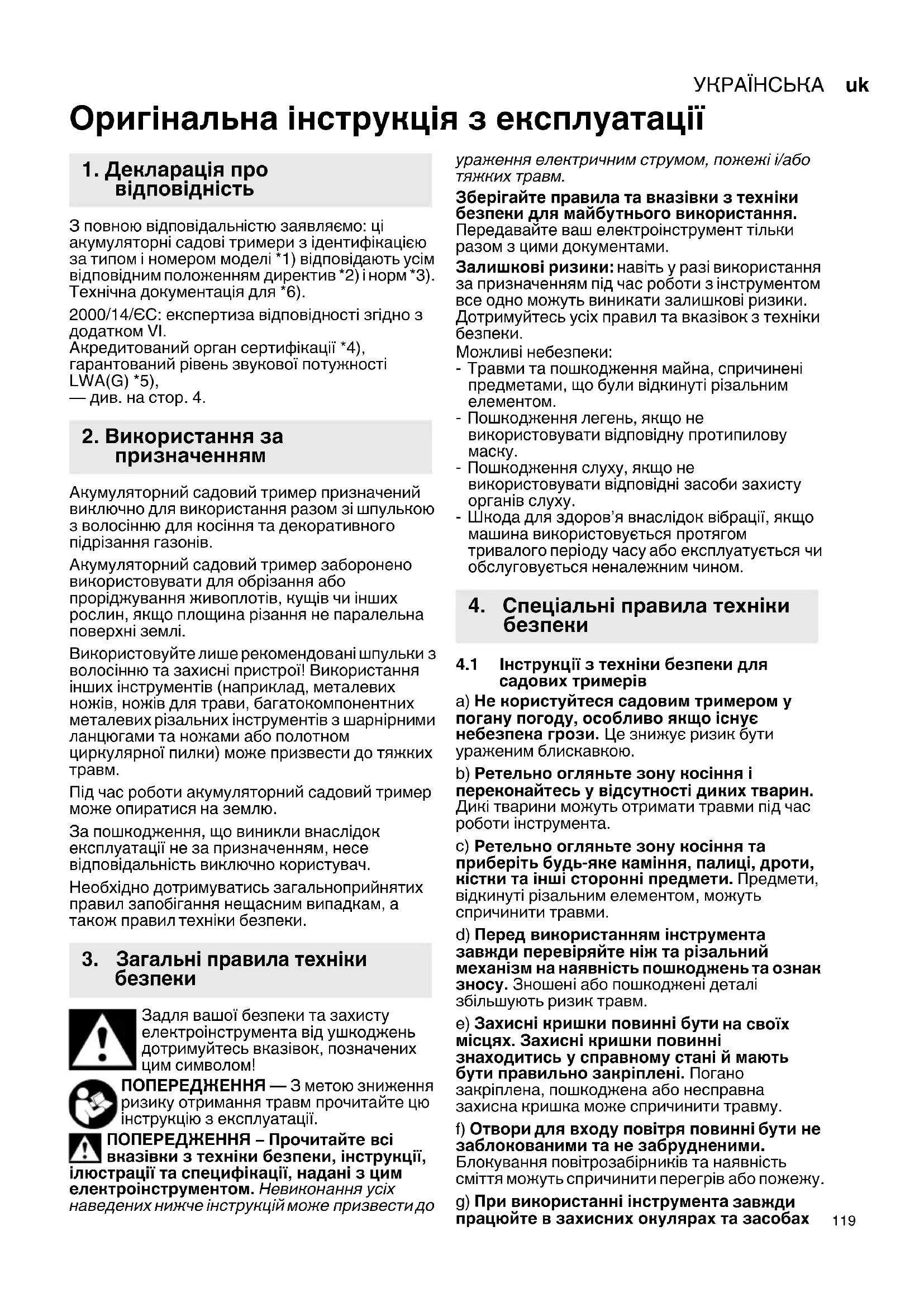 Оригінальна інструкція з експлуатації З повною відповідальністю заявляємо: ці акумуляторні садові тримери з ідентифікацією за типом і номером моделі *1) відповідають усім відповідним положенням директив *2) і норм *3). Технічна документація для *6). 2000/14/ЄС: експертиза відповідності згідно з додатком VІ. Акредитований орган сертифікації *4), гарантований рівень звукової потужності LWA(G) *5), — див. на стор. 4. Акумуляторний садовий тример призначений виключно для використання разом зі шпулькою з волосінню для косіння та декоративного підрізання газонів. Акумуляторний садовий тример заборонено використовувати для обрізання або проріджування живоплотів, кущів чи інших рослин, якщо площина різання не паралельна поверхні землі. Використовуйте лише рекомендовані шпульки з волосінню та захисні пристрої! Використання інших інструментів (наприклад, металевих ножів, ножів для трави, багатокомпонентних металевих різальних інструментів з шарнірними ланцюгами та ножами або полотном циркулярної пилки) може призвести до тяжких