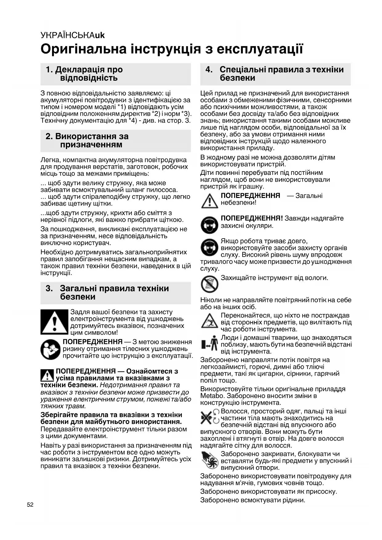Захищайте інструмент від вологи. Ніколи не направляйте повітряний потік на себе або на інших осіб. Переконайтеся, що ніхто не постраждав від сторонніх предметів, що вилітають під час роботи інструмента. Люди і домашні тварини, що знаходяться поблизу, мають бути на безпечній відстані від інструмента. Заборонено направляти потік повітря на легкозаймисті, горючі, димні або тліючі предмети, такі як цигарки, сірники, гарячий попіл тощо. Використовуйте тільки оригінальне приладдя Metabo. Заборонено вносити зміни в конструкцію інструмента. Волосся, просторий одяг, пальці та інші частини тіла мають знаходитись на безпечній відстані від впускного або випускного отворів. Вони можуть бути захоплені і втягнуті в отвір. На довге волосся надягайте сітку для волосся. Заборонено закривати, блокувати чи