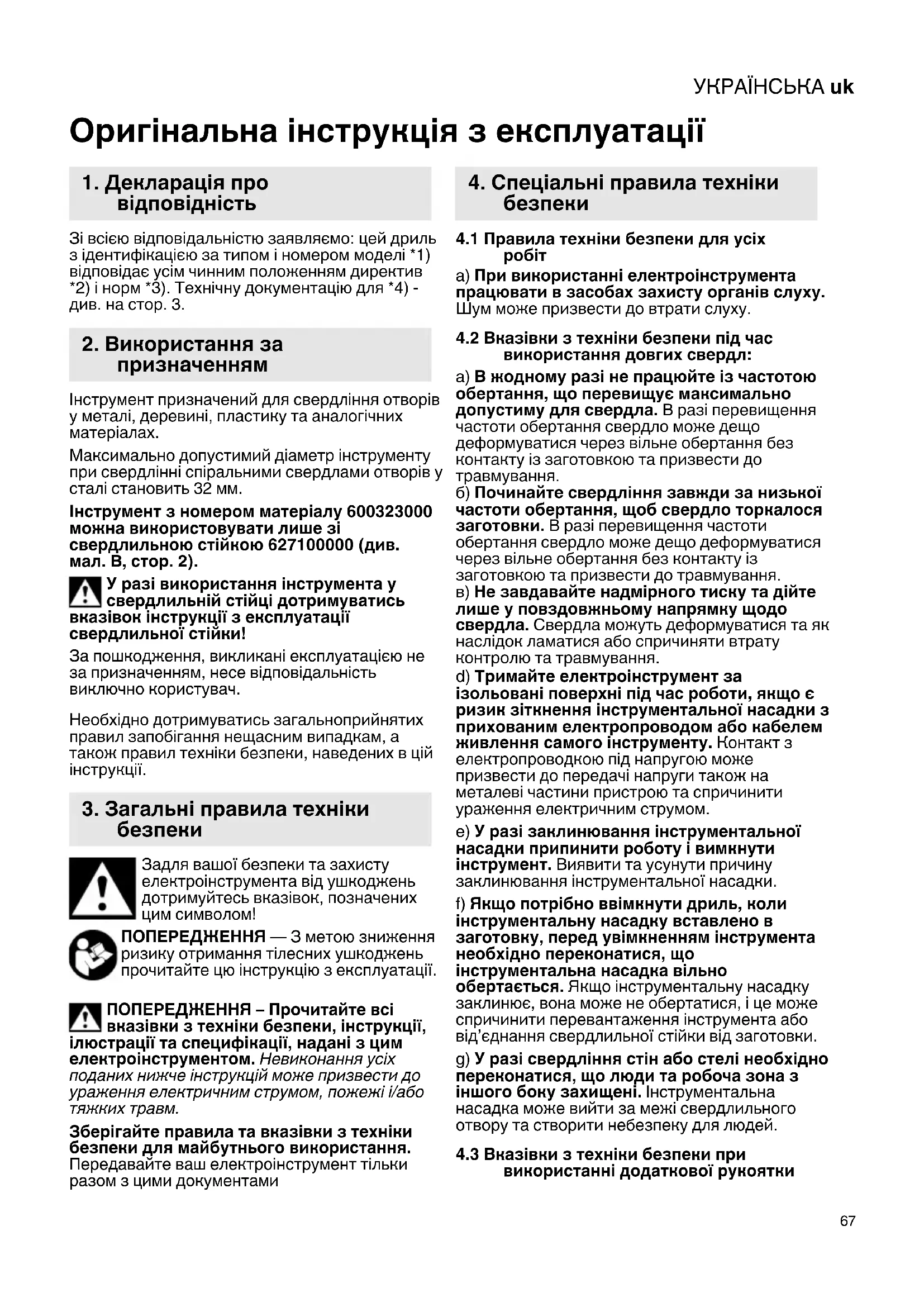 Оригінальна інструкція з експлуатації Зі всією відповідальністю заявляємо: цей дриль з ідентифікацією за типом і номером моделі *1) відповідає усім чинним положенням директив *2) і норм *3). Технічну документацію для *4) - див. на стор. 3. Інструмент призначений для свердління отворів у металі, деревині, пластику та аналогічних матеріалах. Максимально допустимий діаметр інструменту при свердлінні спіральними свердлами отворів у сталі становить 32 мм. Інструмент з номером матеріалу 600323000 можна використовувати лише зі свердлильною стійкою 627100000 (див. мал. B, стор. 2). У разі використання інструмента у свердлильній стійці дотримуватись вказівок інструкції з експлуатації свердлильної стійки! За пошкодження, викликані експлуатацією не за призначенням, несе відповідальність виключно користувач. Необхідно дотримуватись загальноприйнятих правил запобігання нещасним випадкам, а також правил техніки безпеки, наведених в цій інструкції. Задля вашої безпеки та захисту електроінструмента від ушкоджень дотримуйтесь вказівок, позначених цим символом! ПОПЕРЕДЖЕННЯ — З метою зниження ризику отримання тілесних ушкоджень прочитайте цю інструкцію з експлуатації. ПОПЕРЕДЖЕННЯ – Прочитайте всі вказівки з техніки безпеки, інструкції, ілюстрації та специфікації, надані з цим електроінструментом. Невиконання усіх поданих нижче інструкцій може призвести до ураження електричним струмом, пожежі і/або тяжких травм. Зберігайте правила та вказівки з техніки безпеки для майбутнього використання. Передавайте ваш електроінструмент тільки разом з цими документами