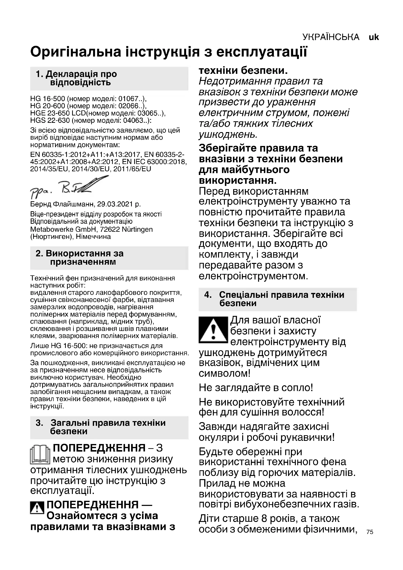 Оригінальна інструкція з експлуатації HG 16-500 (номер моделі: 01067..), HG 20-600 (номер моделі: 02066..), HGE 23-650 LCD(номер моделі: 03065..), HGS 22-630 (номер моделі: 04063..): Зі всією відповідальністю заявляємо, що цей виріб відповідає наступним нормам або нормативним документам: EN 60335-1:2012+A11:+A13:2017, EN 60335-2- 45:2002+A1:2008+A2:2012, EN IEC 63000:2018, 2014/35/EU, 2014/30/EU, 2011/65/EU Бернд Флайшманн, 29.03.2021 р. Віце-президент відділу розробок та якості Відповідальний за документацію Metabowerke GmbH, 72622 Nürtingen (Нюртинген), Німеччина Технічний фен призначений для виконання наступних робіт: видалення старого лакофарбового покриття, сушіння свіжонанесеної фарби, відтавання замерзлих водопроводів, нагрівання полімерних матеріалів перед формуванням, спаювання (наприклад, мідних труб), склеювання і розшивання швів плавкими клеями, зварювання полімерних матеріалів. Лише HG 16-500: не призначається для промислового або комерційного використання. За пошкодження, викликані експлуатацією не за призначенням несе відповідальність виключно користувач. Необхідно дотримуватись загальноприйнятих правил запобігання нещасним випадкам, а також правил техніки безпеки, наведених в цій інструкції. ПОПЕРЕДЖЕННЯ – З метою зниження ризику отримання тілесних ушкоджень прочитайте цю інструкцію з експлуатації. ПОПЕРЕДЖЕННЯ — Ознайомтеся з усіма правилами та вказівками з техніки безпеки. Недотримання правил та вказівок з техніки безпеки може призвести до ураження електричним струмом, пожежі та/або тяжких тілесних