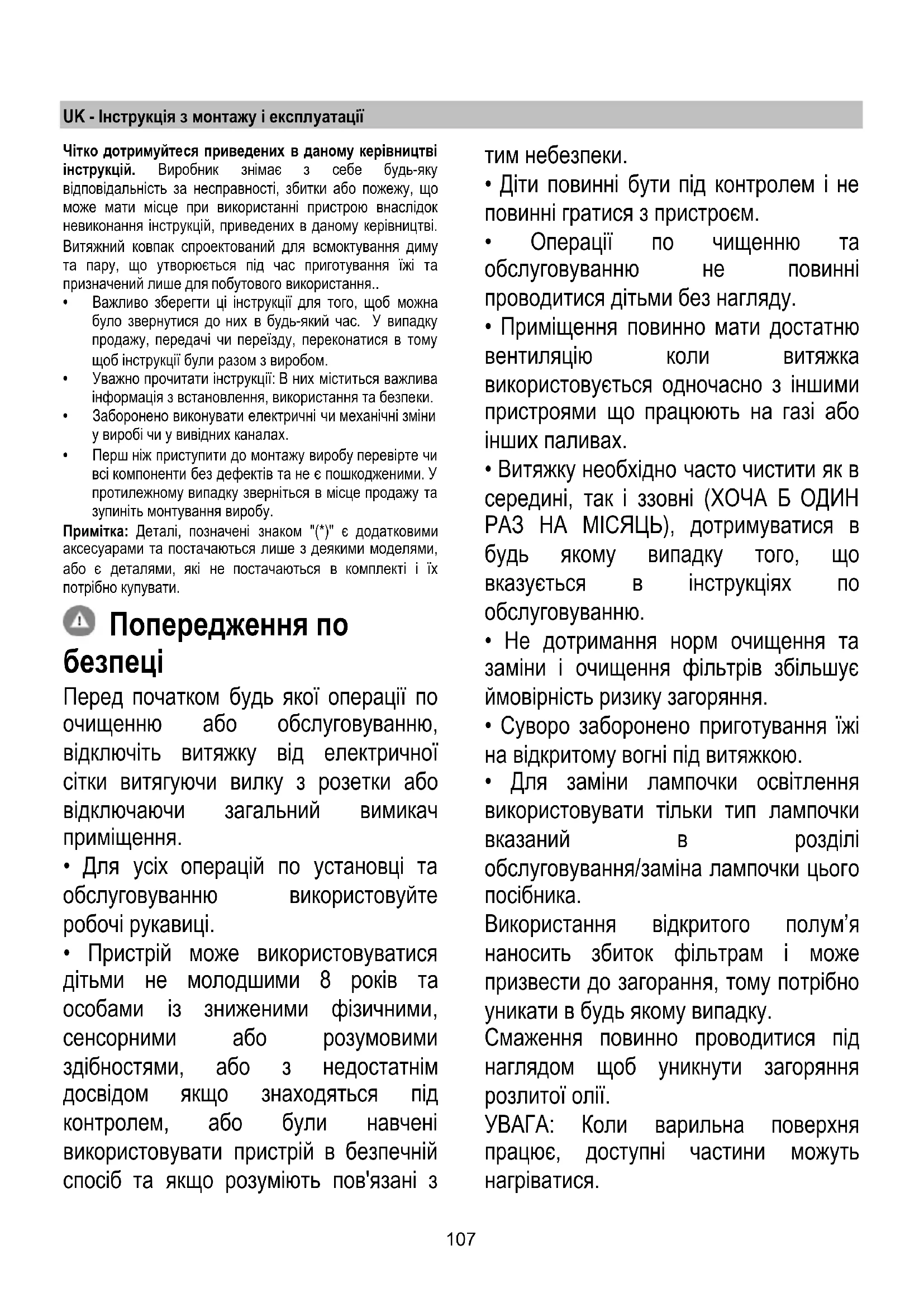 - Витяжка НІКОЛИ не повинна використовуватися як опорна поверхня, якщо тільки не вказується.