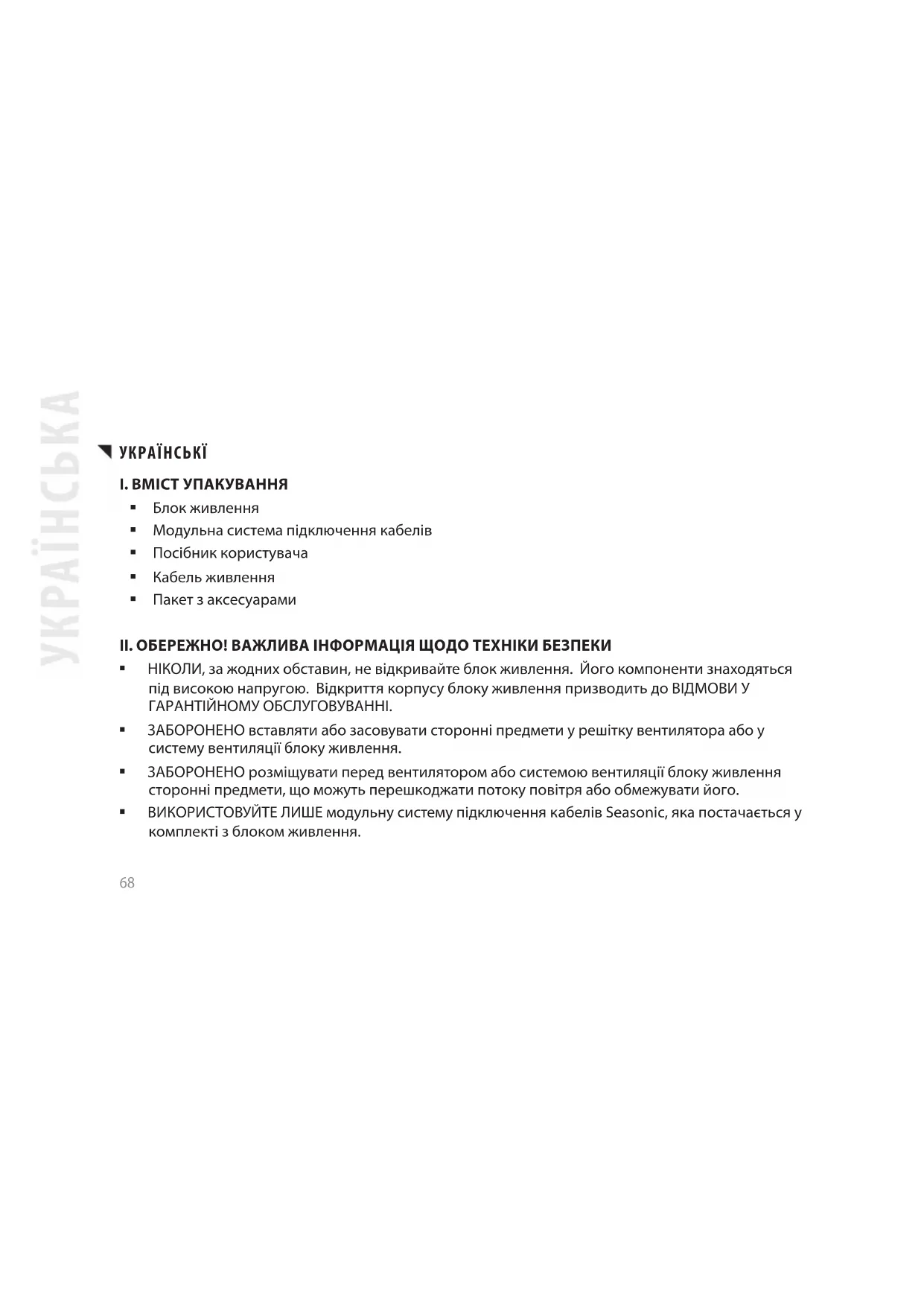 НІКОЛИ, за жодних обставин, не відкривайте блок живлення. Його компоненти знаходяться під високою напругою. Відкриття корпусу блоку живлення призводить до ВІДМОВИ У ГАРАНТІЙНОМУ ОБСЛУГОВУВАННІ. ЗАБОРОНЕНО вставляти або засовувати сторонні предмети у решітку вентилятора або у систему вентиляції блоку живлення. ЗАБОРОНЕНО розміщувати перед вентилятором або системою вентиляції блоку живлення сторонні предмети, що можуть перешкоджати потоку повітря або обмежувати його. ВИКОРИСТОВУЙТЕ ЛИШЕ модульну систему підключення кабелів Seasonic, яка постачається у комплекті з блоком живлення.