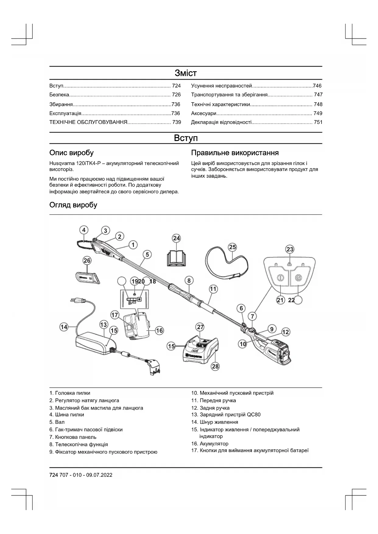 748 707 - 010 - 09.07.2022120iTK4-P Висунута, передня ручка/задня ручка 1,475/ 0,773 Установлюйте у виріб лише оригінальні акумулятори Husqvarna BLi. Схвалені акумулятори Акумулятор BLi10 Тип Літій-іонний Ємність батареї, ампер-години Див. паспортну табличку акумулятора Номінальна напруга, В 36 Вага, кг 0,8 Сертифіковані зарядні пристрої Зарядний пристрій QC 80 40-C80 Вхідна напруга, В 100–240 100–240 Частота, Гц 50–60 50–60 Потужність, Вт 80 72