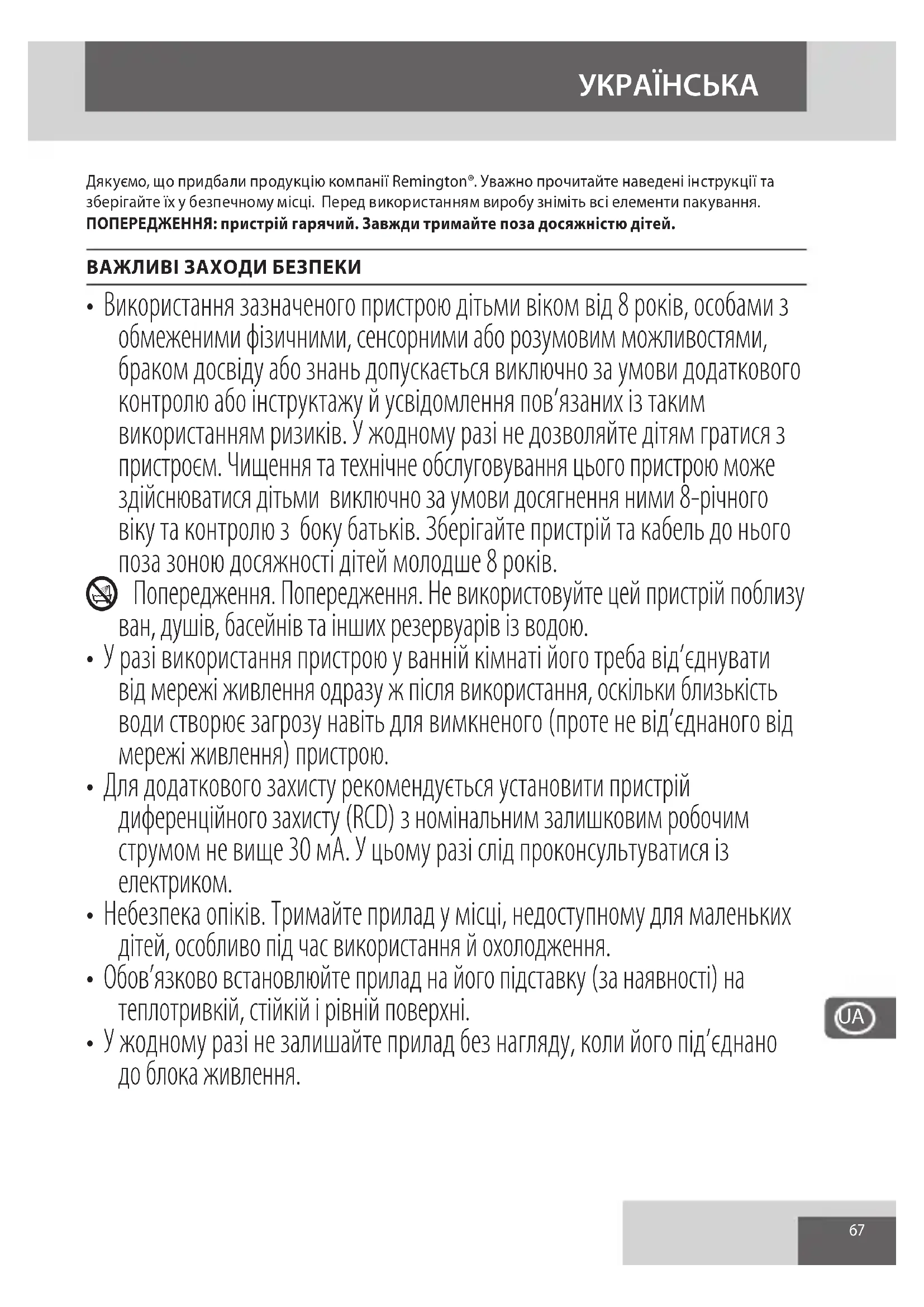 Дякуємо, що придбали продукцію компанії Remington®. Уважно прочитайте наведені інструкції та зберігайте їх у безпечному місці. Перед використанням виробу зніміть всі елементи пакування. ПОПЕРЕДЖЕННЯ: пристрій гарячий. Завжди тримайте поза досяжністю дітей. ВАЖЛИВІ ЗАХОДИ БЕЗПЕКИ