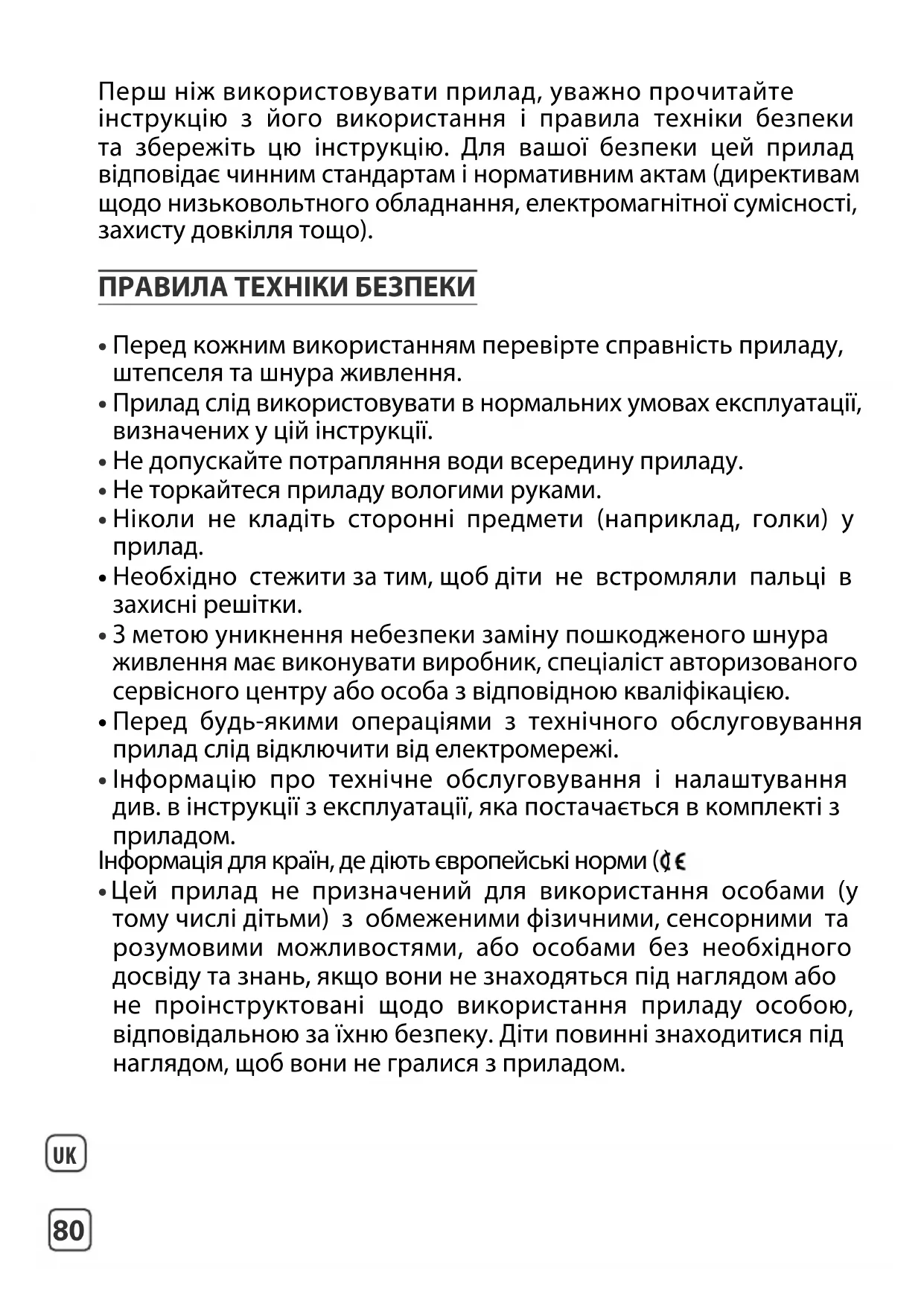 - Цей прилад не призначений для використання особами (у тому числі дітьми) з обмеженими фізичними, сенсорними та розумовими можливостями, або особами без необхідного досвіду та знань, якщо вони не знаходяться під наглядом або не проінструктовані щодо використання приладу особою, відповідальною за їхню безпеку. Діти повинні знаходитися під наглядом, щоб вони не гралися з приладом.UK
